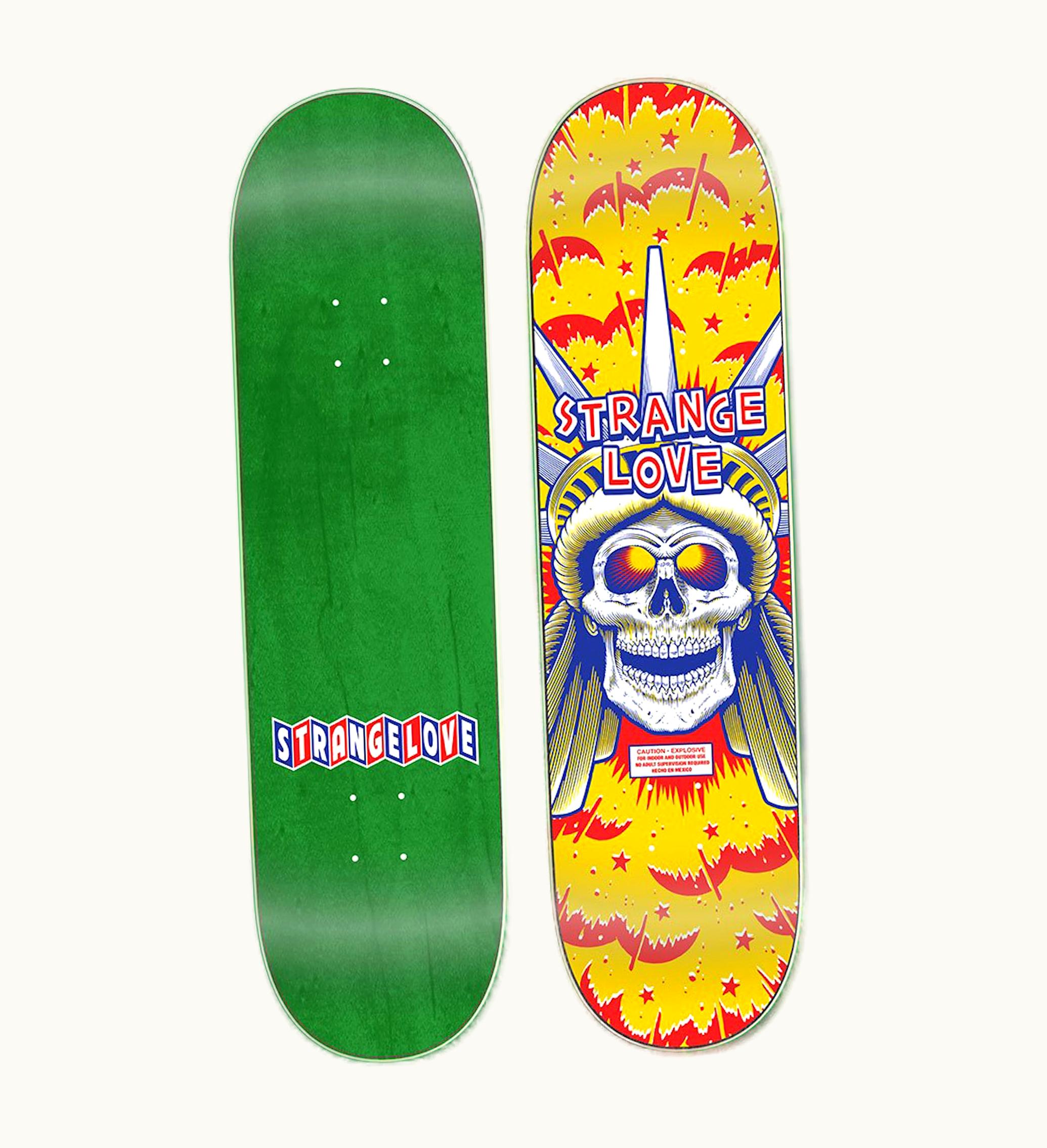 StrangeLove Liberty 8.5 Liberty 8.5 is a premium quality skateboard deck that features a unique design inspired by the iconic Statue of Liberty. It measures 8.5 inches in width, making it ideal for both street skating and park skating. Constructed from high-quality Canadian maple wood, this skateboard deck is durable and sturdy, able to withstand the wear and tear of regular use. It has a medium concave design that provides excellent control and stability, allowing riders to execute tricks with precision and ease. The StrangeLove Liberty 8.5 Liberty 8.5 skateboard deck comes with a beautiful red, white, and blue colorway, which in combination with the intricate graphic design, makes for a striking and eye-catching appearance. It is a great deck for both experienced riders and beginners, and it is sure to turn heads at the skatepark.