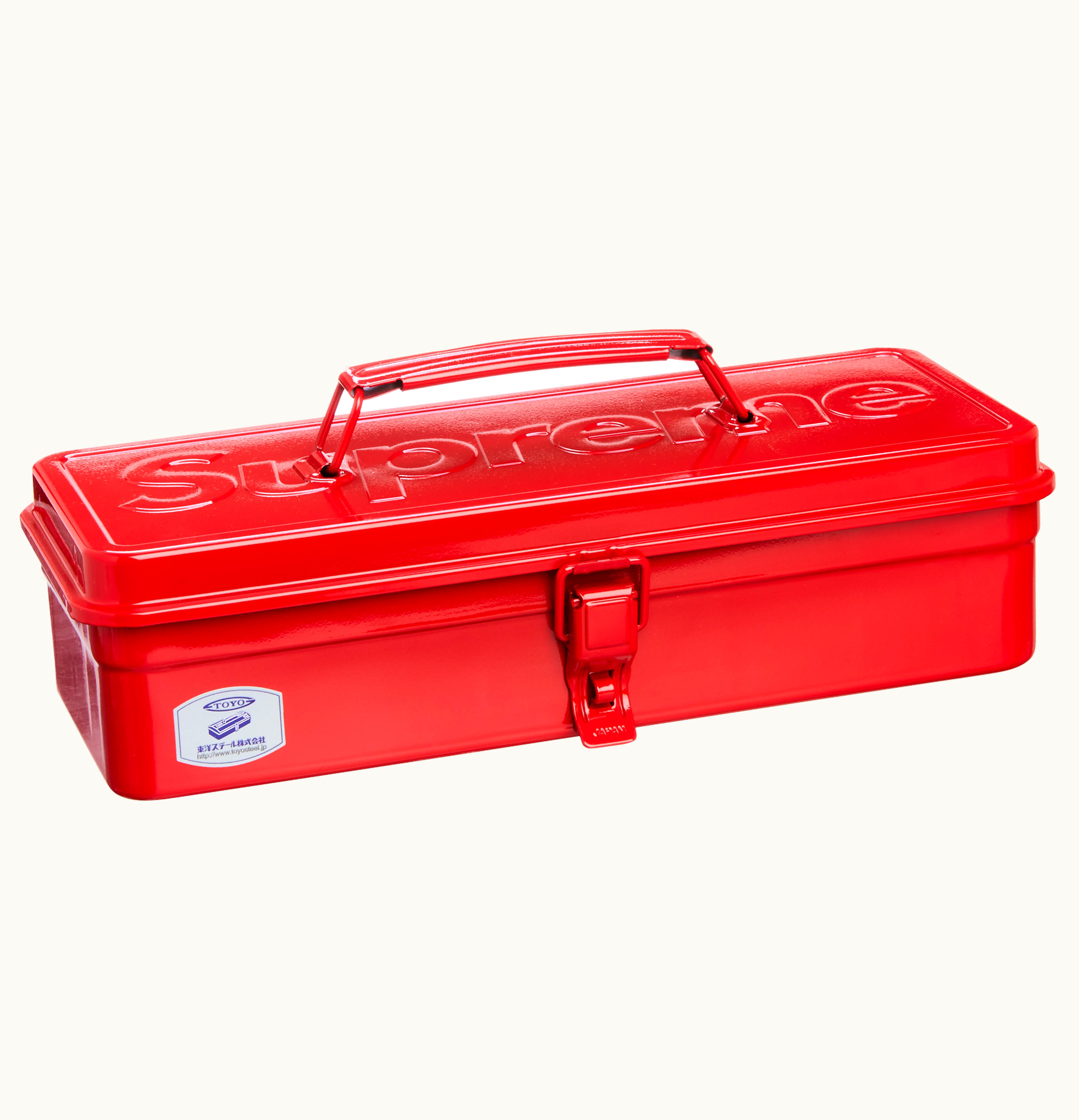 The classic red Steel T 320 Toolbox from Supreme boasts the iconic brand's logo embossed at the top. Manufactured in Japan in partnership with TOYO, this steel toolbox comes with a rounded top handle and a cylinder lock to ensure that all your belongings remain organized and secure. The toolbox measures 13.1" x 5.4" x 3.8" inches and is designed in line with the striking red color theme, reflecting the brand's signature aesthetic. The Supreme TOYO Steel T 320 Toolbox Red hit the market on August 25th, 2022, and is available at GLINT with a suggested retail price of $48.