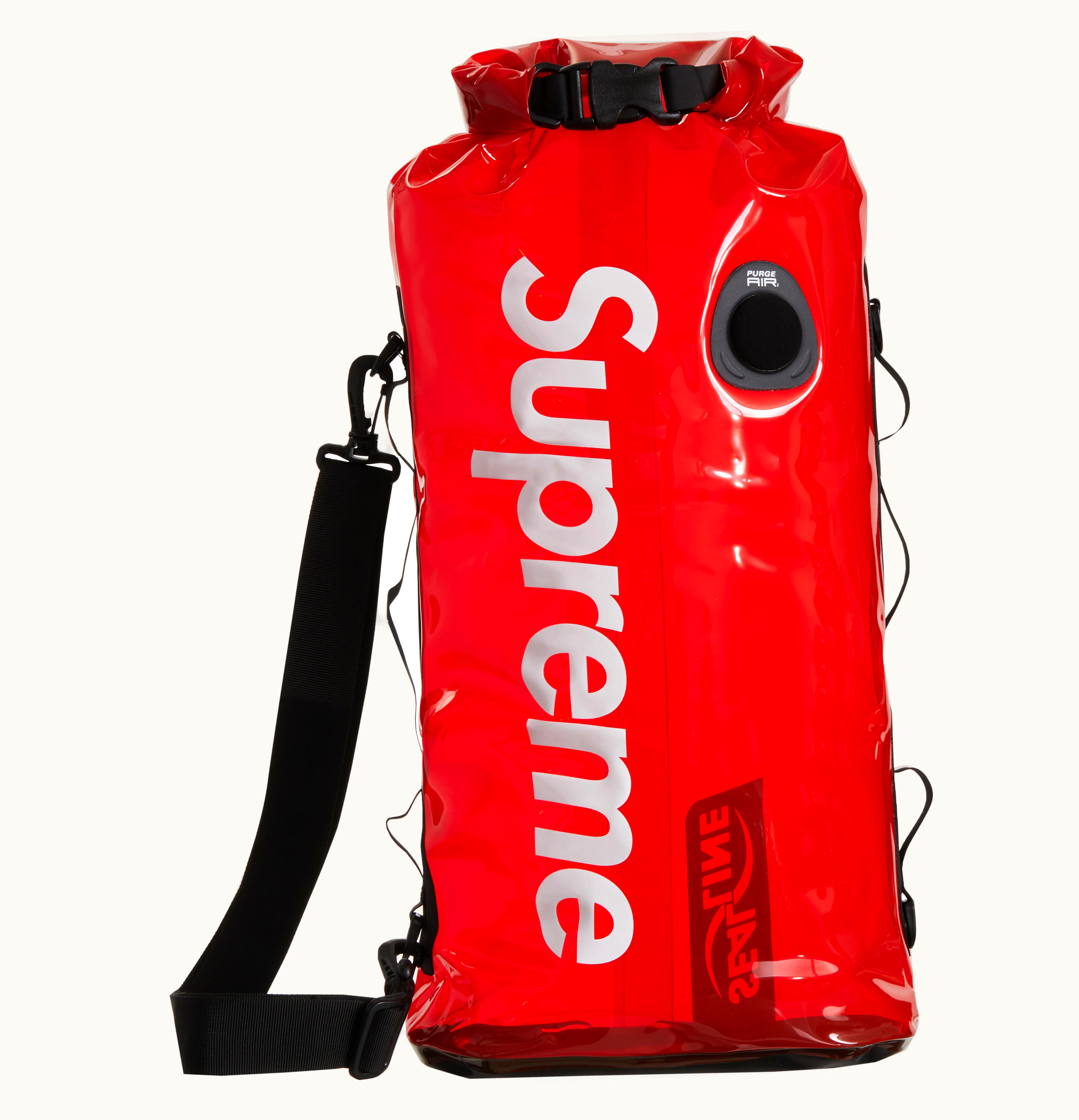 The Supreme SealLine Discovery is a high-quality waterproof dry bag designed for outdoor enthusiasts and adventurers. It is made from durable materials and features a roll-top closure with a secure buckle for maximum protection from water, dust, and other elements. The bag is available in various sizes, ranging from 5 liters to 55 liters, making it perfect for storing and carrying a wide range of gear and equipment, including clothing, electronics, and food. It is also equipped with D-rings for easy attachment to backpacks or other gear, and the fabric is abrasion-resistant for added durability. With its reliable construction and versatile design, the Supreme SealLine Discovery is an excellent choice for anyone who wants to keep their gear safe and dry during outdoor adventures.