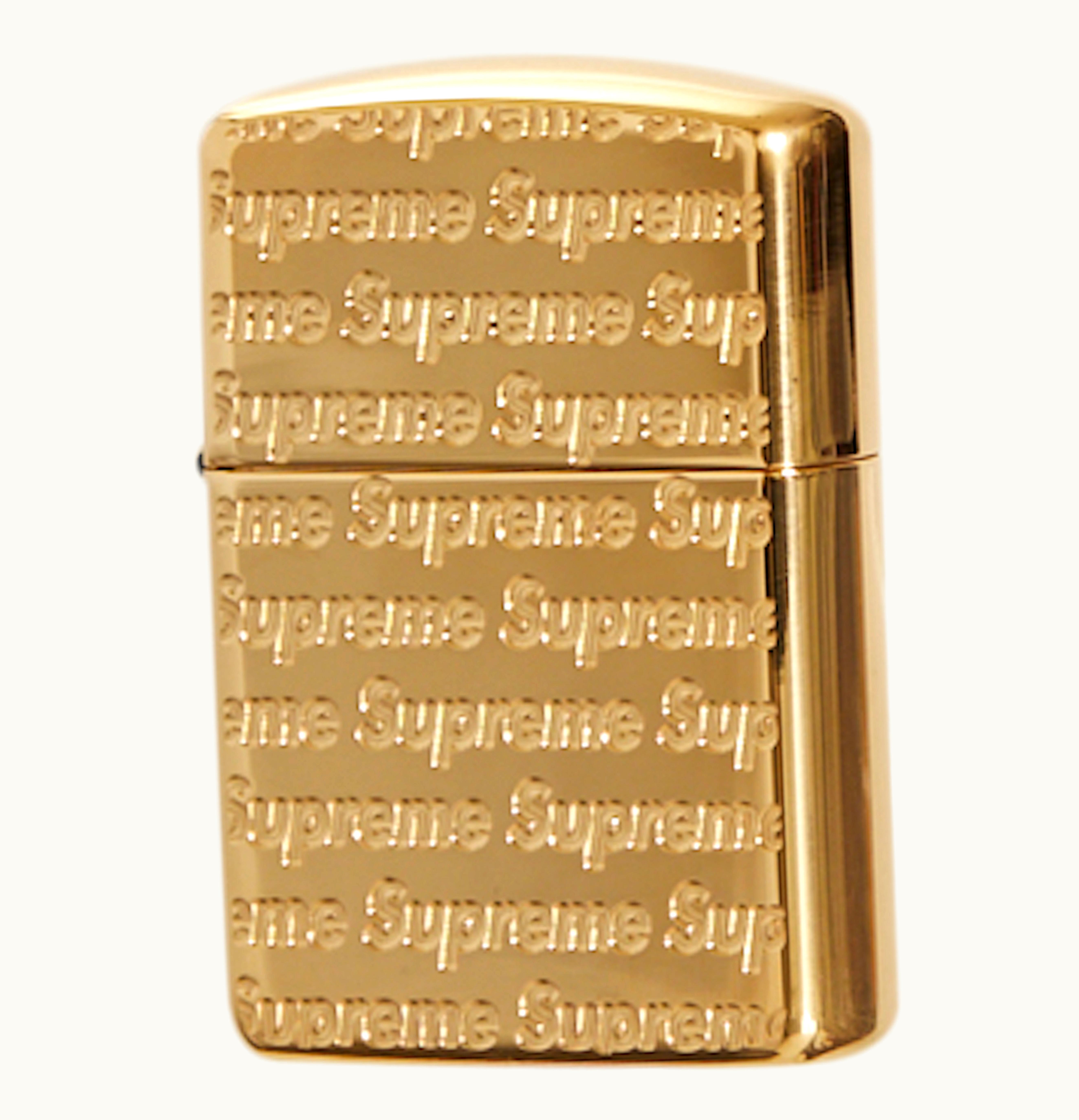 The Zippo Gold from Supreme, adorned with the brand's logo engraved repeatedly, boasts a lustrous golden finish. Constructed entirely of metal, the windproof design comes with the signature Zippo click and the ability to refill. This product is made in the USA and measures 2.25 inches high with a depth of 1.5 inches, weighing approximately 2 ounces. The GLINT released the Supreme Repeat Engraved Zippo Gold on September 22nd, 2022, at a retail cost of $60.