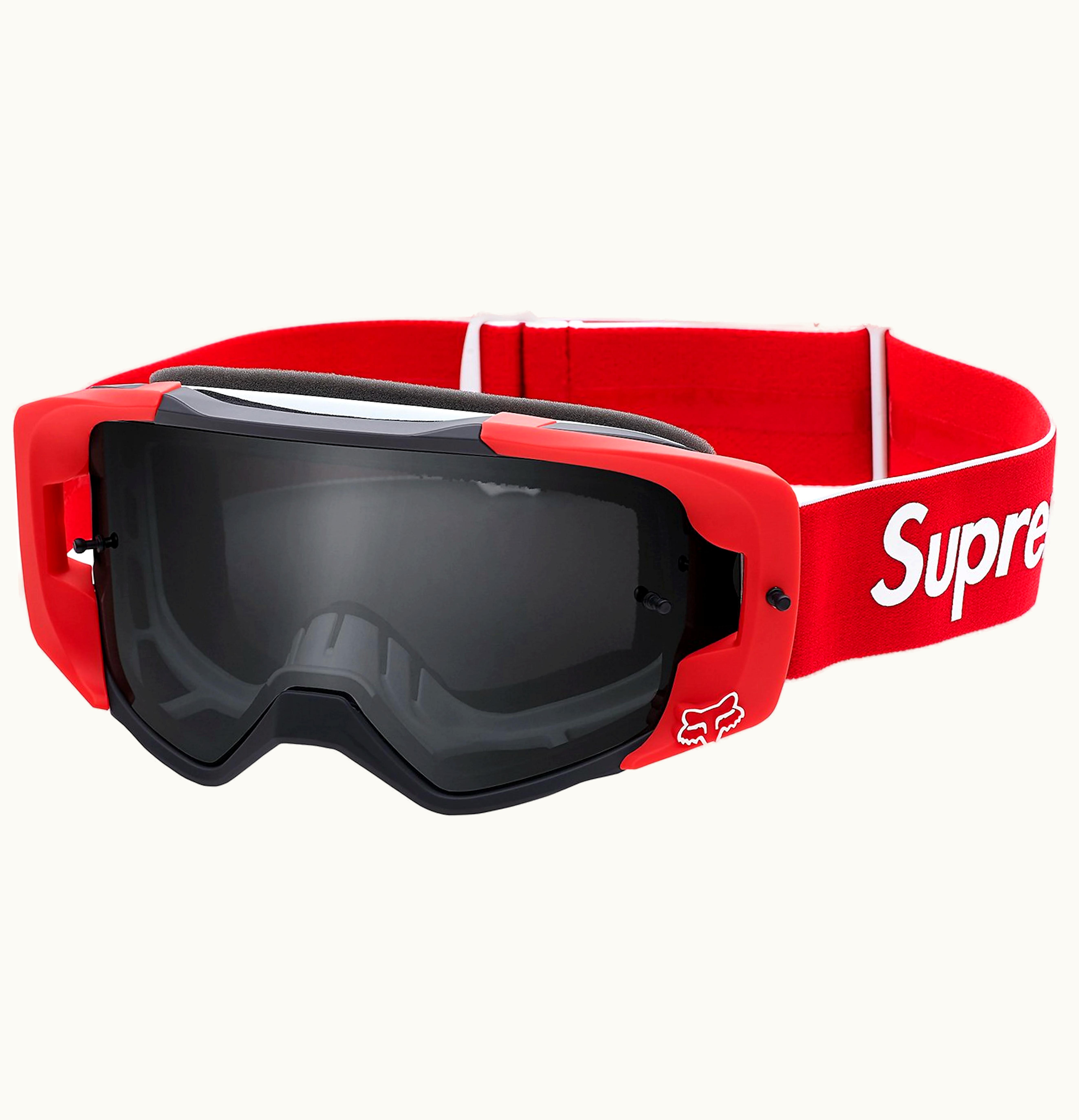The red Supreme Fox Racing VUE Goggles showcase the iconic Supreme logo, plastered prominently on both sides of the goggles. The lenses are made from pre-curved, injection-molded polycarbonate material that offers high-speed impact resistance and clear optical vision. The faceplate, which comes in sleek black, is crafted with soft TPU material and a translucent visor that conforms to the shape of the wearer's face. Additionally, the goggles feature a 3-layer molded foam that ensures a comfortable fit. These limited edition goggles were originally priced at $148 when they dropped on May 10th, 2018 and can now be found on GLINT.
