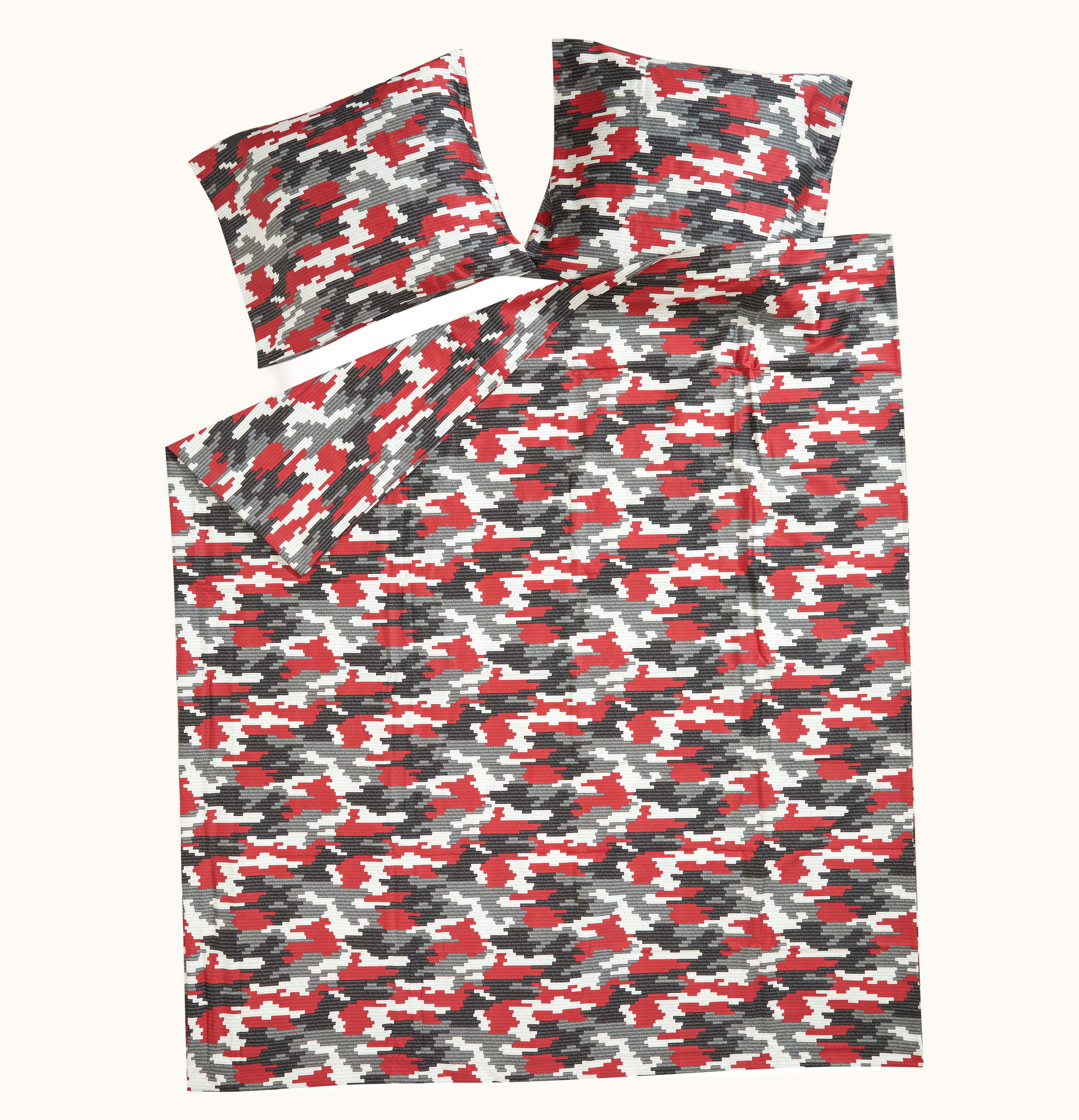 The Supreme Logo Camo Duvet + Pillow is the ultimate bedding accessory for fans of the iconic streetwear brand. The duvet and pillow are adorned with the classic Supreme logo, printed on a sleek and stylish camouflage design. The duvet and pillow are made from high-quality, soft and breathable cotton, ensuring a comfortable night's sleep. The set comes with a single duvet cover and pillowcase, perfect for adding a touch of Supreme style to your bedroom. The Supreme Logo Camo Duvet + Pillow is a must-have for any streetwear enthusiast or Supreme fan looking to elevate their bedroom decor.