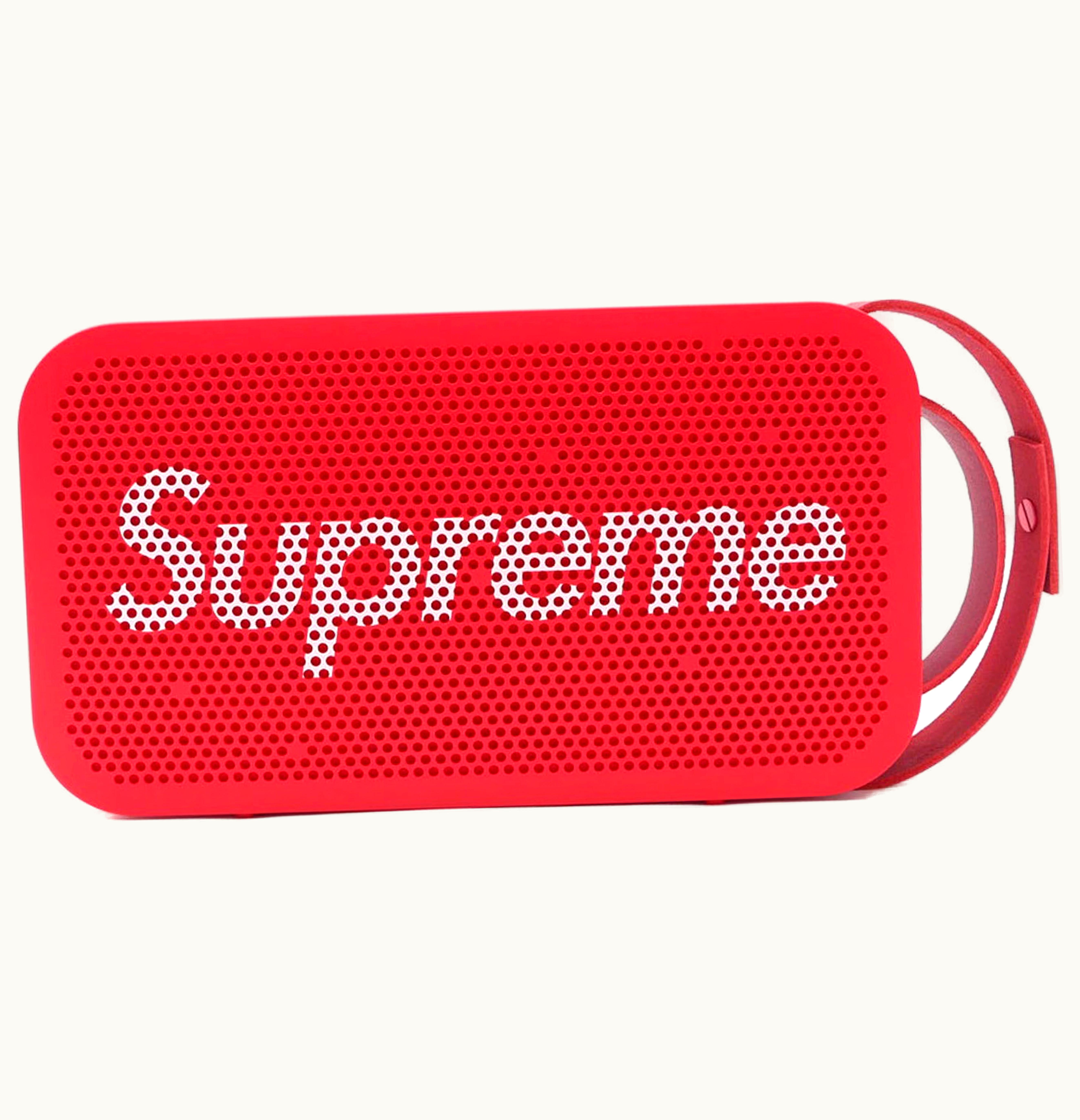 The Supreme B&O Play By Bang Olufsen A2 Portable speaker is a limited edition collaboration between Supreme and Bang Olufsen. This portable speaker delivers high-quality audio with its advanced audio technology and powerful drivers. It has a sleek, minimalist design with a white body and Supreme's iconic red box logo on the front. The speaker is Bluetooth-enabled, allowing you to stream music wirelessly from your smartphone or tablet. It also has a rechargeable battery that provides up to 24 hours of playtime. Overall, the Supreme B&O Play By Bang Olufsen A2 Portable speaker is a perfect combination of style and functionality, making it an essential accessory for any music lover on the go.
