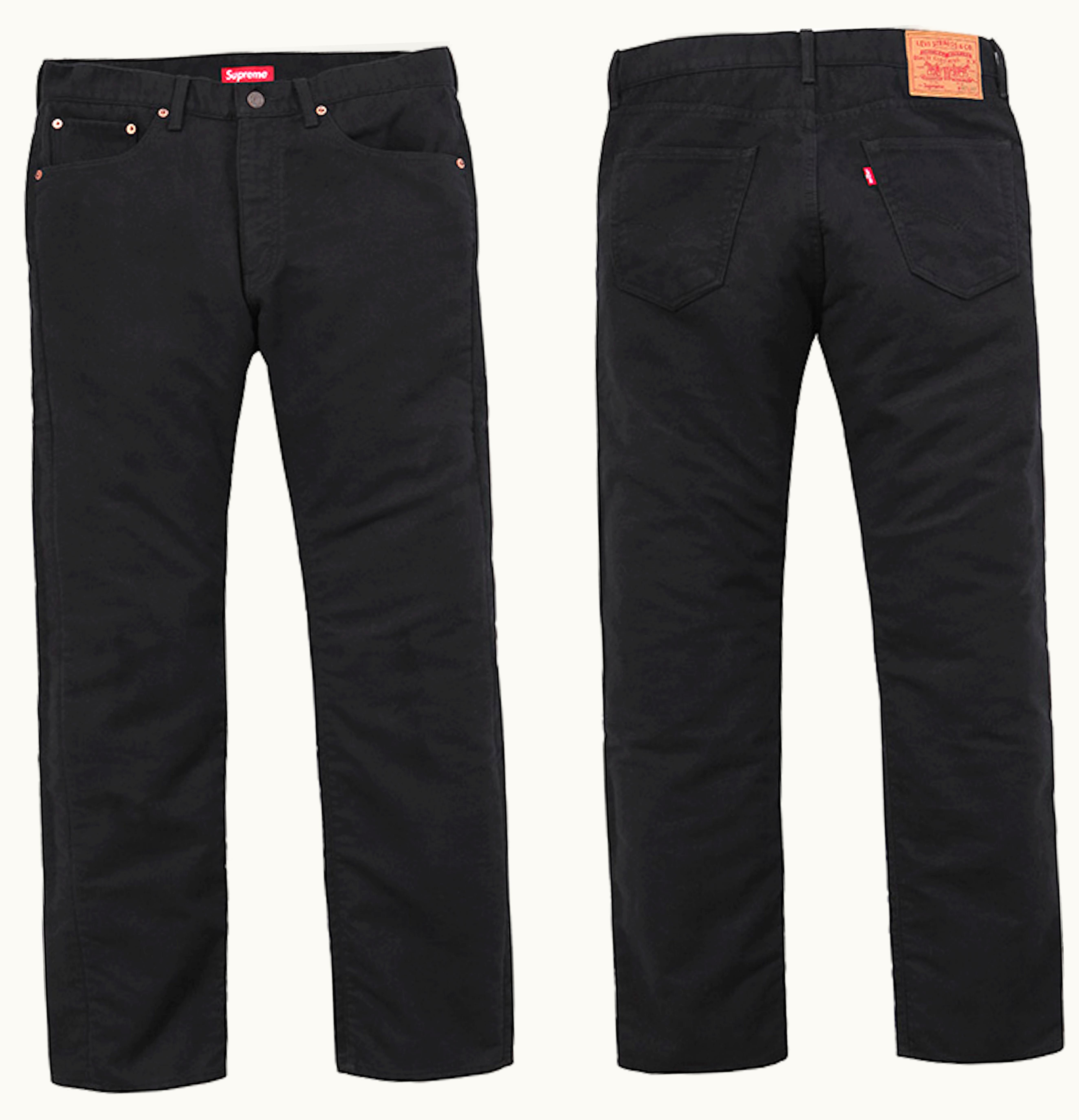 The Supreme Levis Moleskin 505 is a collaboration between Supreme, the popular streetwear brand, and Levi's, the iconic denim label. The 505 is a classic straight-leg jean that has been updated with a soft, durable moleskin fabric. The moleskin material gives the pants a unique texture and finish that is both comfortable and stylish. The pants feature a five-pocket design with a zip fly and button closure. The Supreme branding is subtly integrated into the design, with a small red tag on the back pocket and Supreme's iconic box logo embroidered on the front left pocket. Overall, the Supreme Levis Moleskin 505 is a fashionable and functional piece that seamlessly merges streetwear and heritage apparel design.