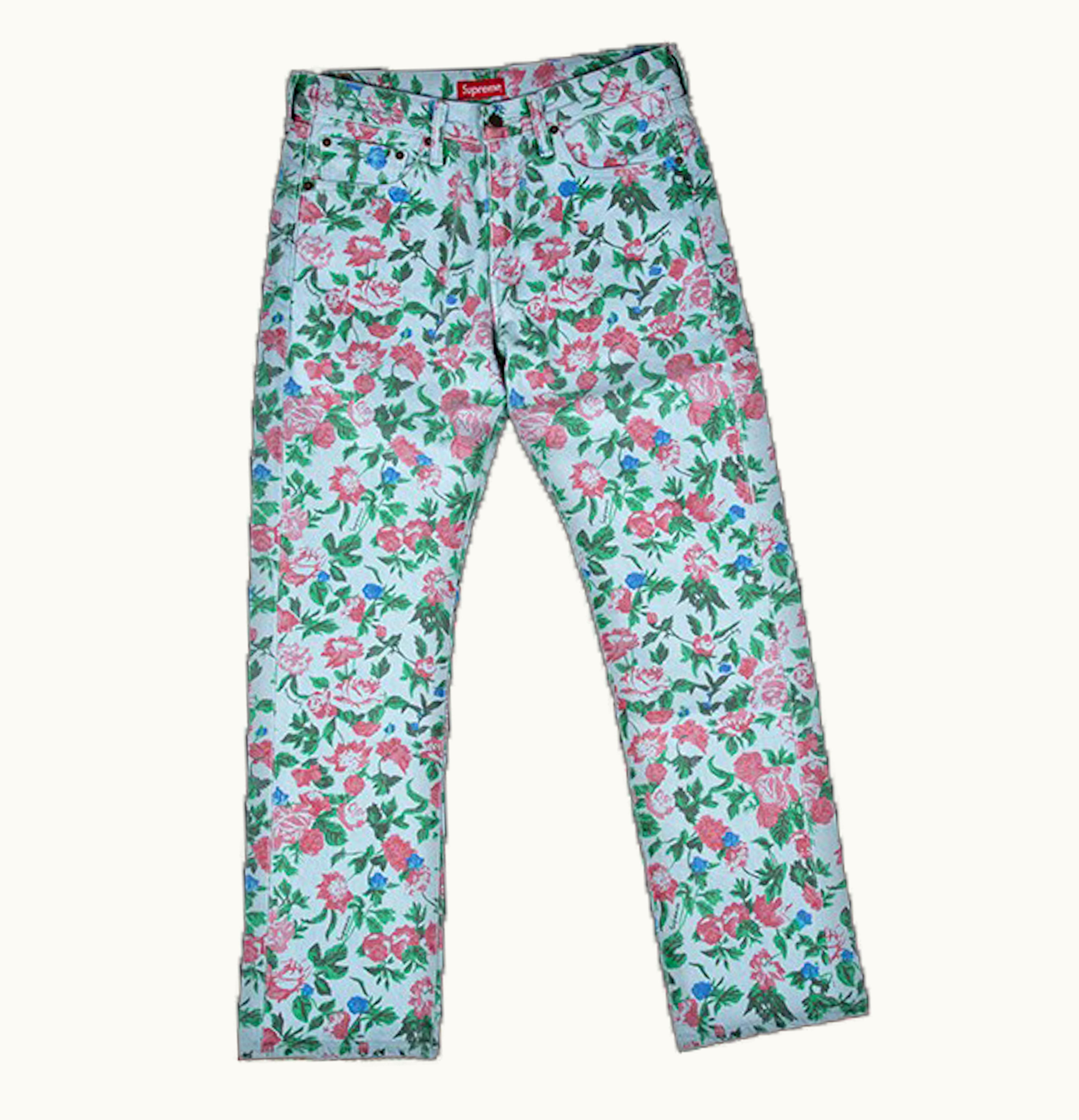 The Supreme Levi's Roses 505 is a limited edition denim jean designed by the brand Supreme in collaboration with Levi's. The color of the jean is a faded blue wash featuring an all-over print of red roses, giving it a unique and bold look. It is constructed from high-quality Levi's 505 denim, which is known for its durability and comfort. The jean has a straight leg cut and a mid-rise waistline, providing a relaxed fit that's ideal for everyday wear. It includes classic five-pocket styling and signature Levi's branding. This product is perfect for fashion-forward individuals who are looking for a stylish and unique pair of jeans.