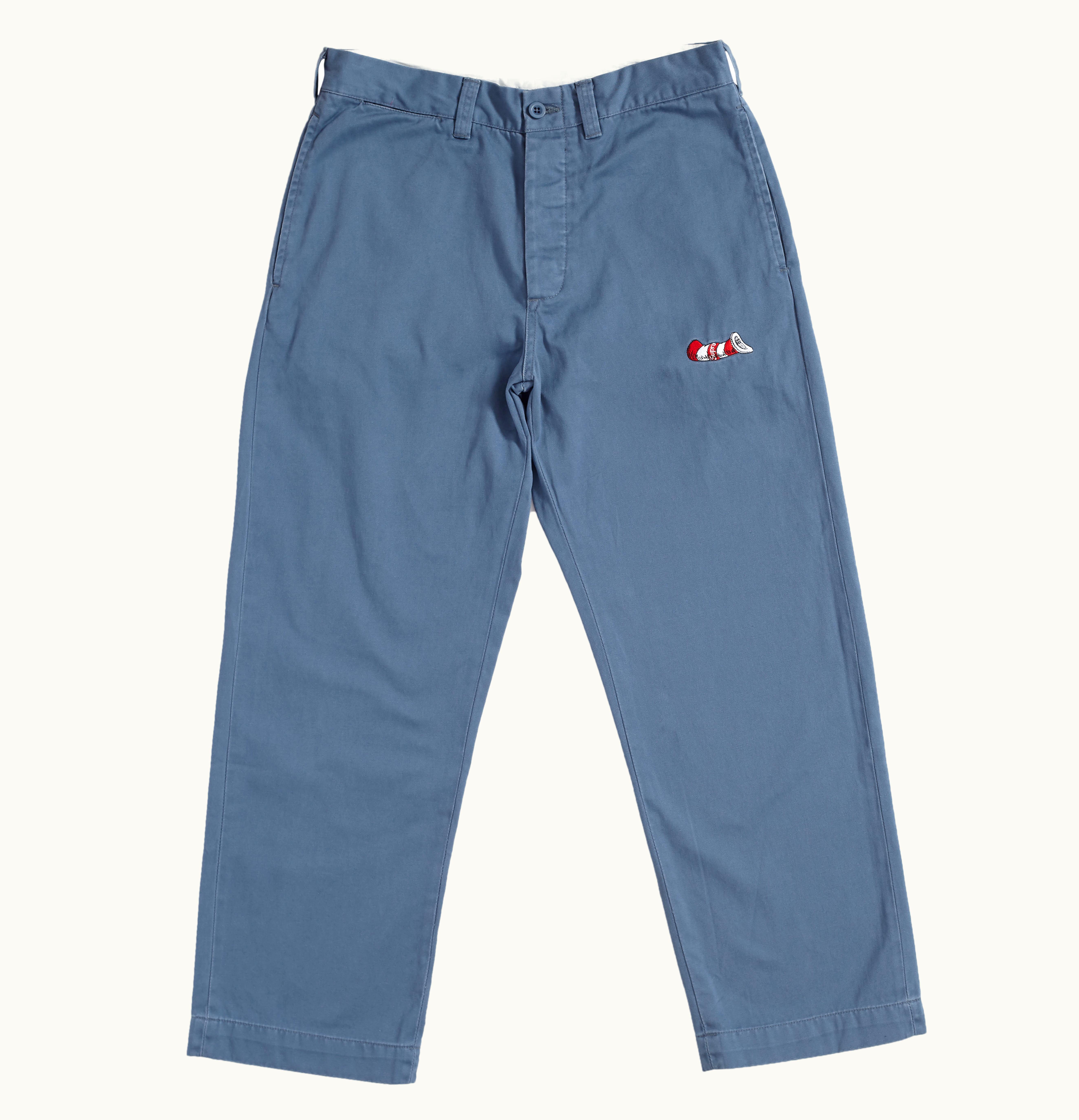 The Supreme Cat in the Hat Chino is a pair of pants designed with inspiration from the popular children's book "The Cat in the Hat". These pants feature a classic chino silhouette, with a relaxed fit and straight leg. The material is made with 100% cotton, providing a comfortable and durable wear. The design incorporates the iconic red and white stripes of the Cat's hat vertically down the legs. The Supreme box logo is embroidered on the right rear pocket, adding a touch of brand recognition. These pants are sure to make a statement and are perfect for any fan of the classic Dr. Seuss tale.