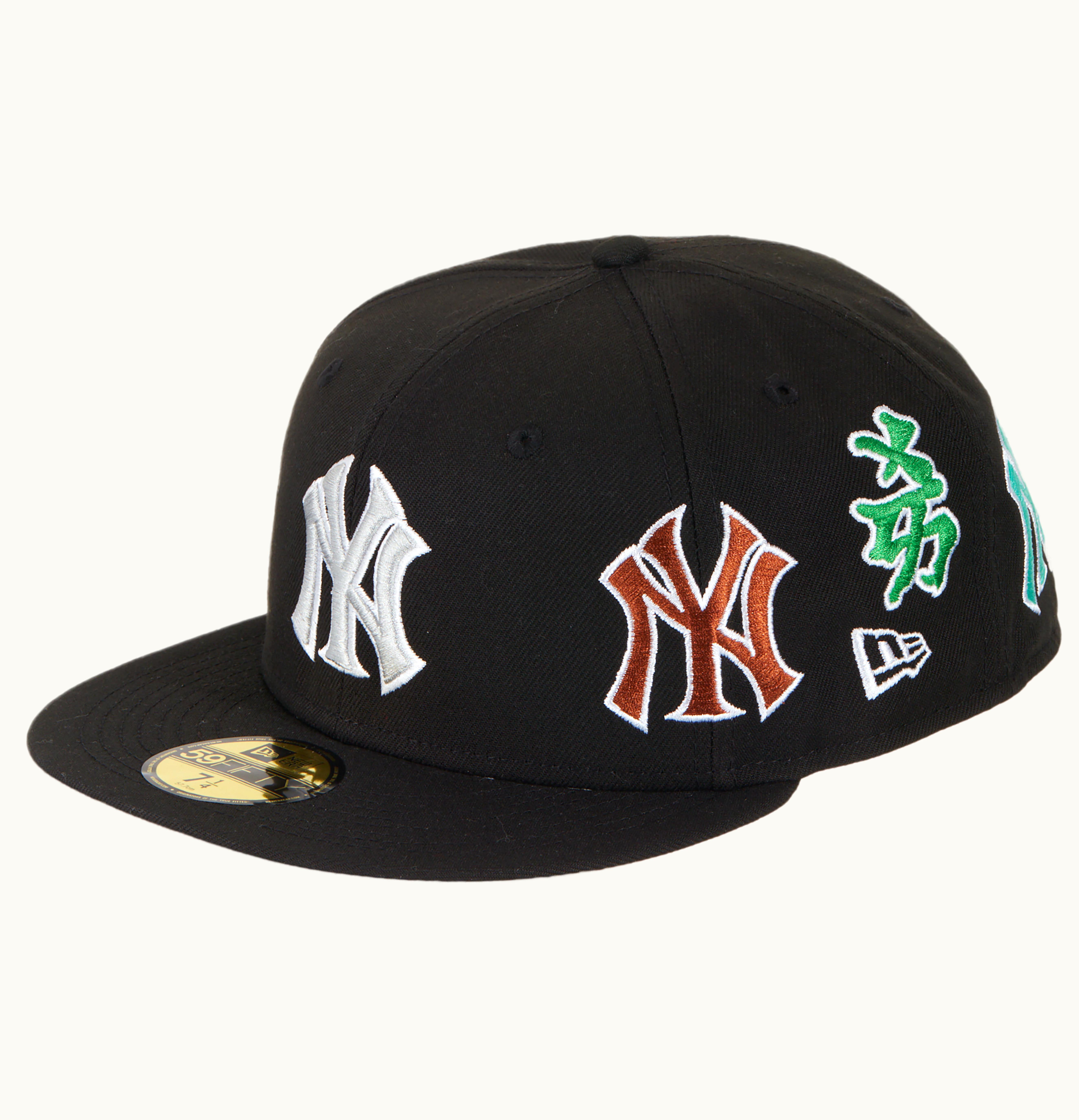 The Supreme New York Yankees Kanji New Era Fitted Cap is a premium quality baseball cap designed for Supreme and New York Yankees fans. Made from durable polyester material in a black colorway, this cap features Kanji-inspired embroidery that spells out the team name in Japanese characters. The cap has a classic 59FIFTY fit with a structured crown, a flat visor, and a raised embroidered New York Yankees logo on the front. It comes in a range of sizes and features a New Era logo on the left side and a Supreme logo on the back. Perfect for anyone looking for a stylish and unique way to show their love for the Yankees and Supreme.