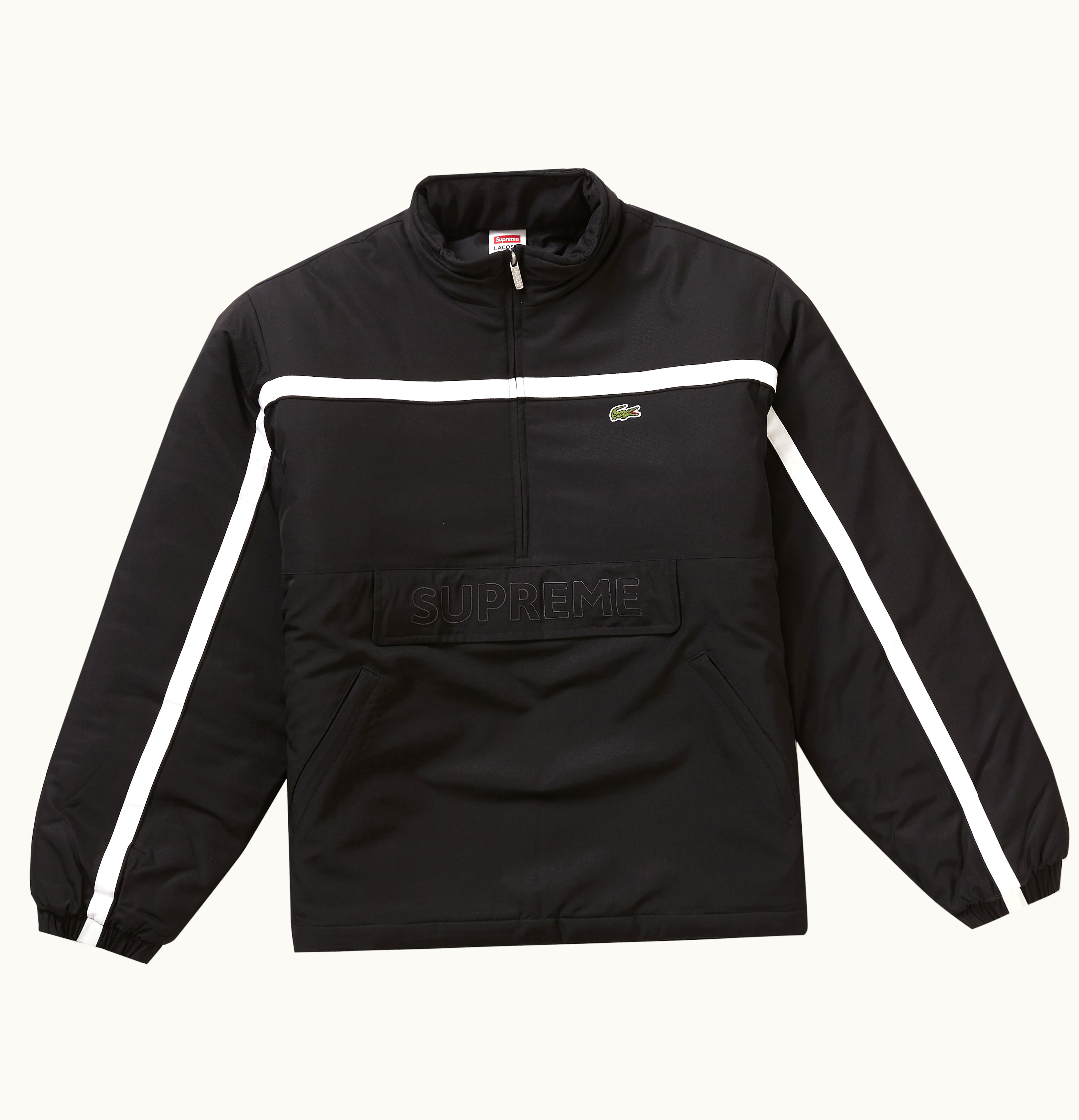 The Supreme LACOSTE Puffy Half Zip is a stylish and functional piece of outerwear designed in collaboration between two iconic brands. Featuring a half-zip closure, this jacket is made from high-quality nylon fabric with a puffy construction that provides excellent insulation and warmth. The jacket is filled with a soft down blend that is incredibly lightweight, making it easy to wear and move in. The design of the jacket is complemented by the classic LACOSTE crocodile logo on the left chest and the Supreme branding on the right chest. This jacket is perfect for a casual yet stylish look while also keeping you warm during cold weather. It is available in a range of sizes and colors to fit every style and preference.