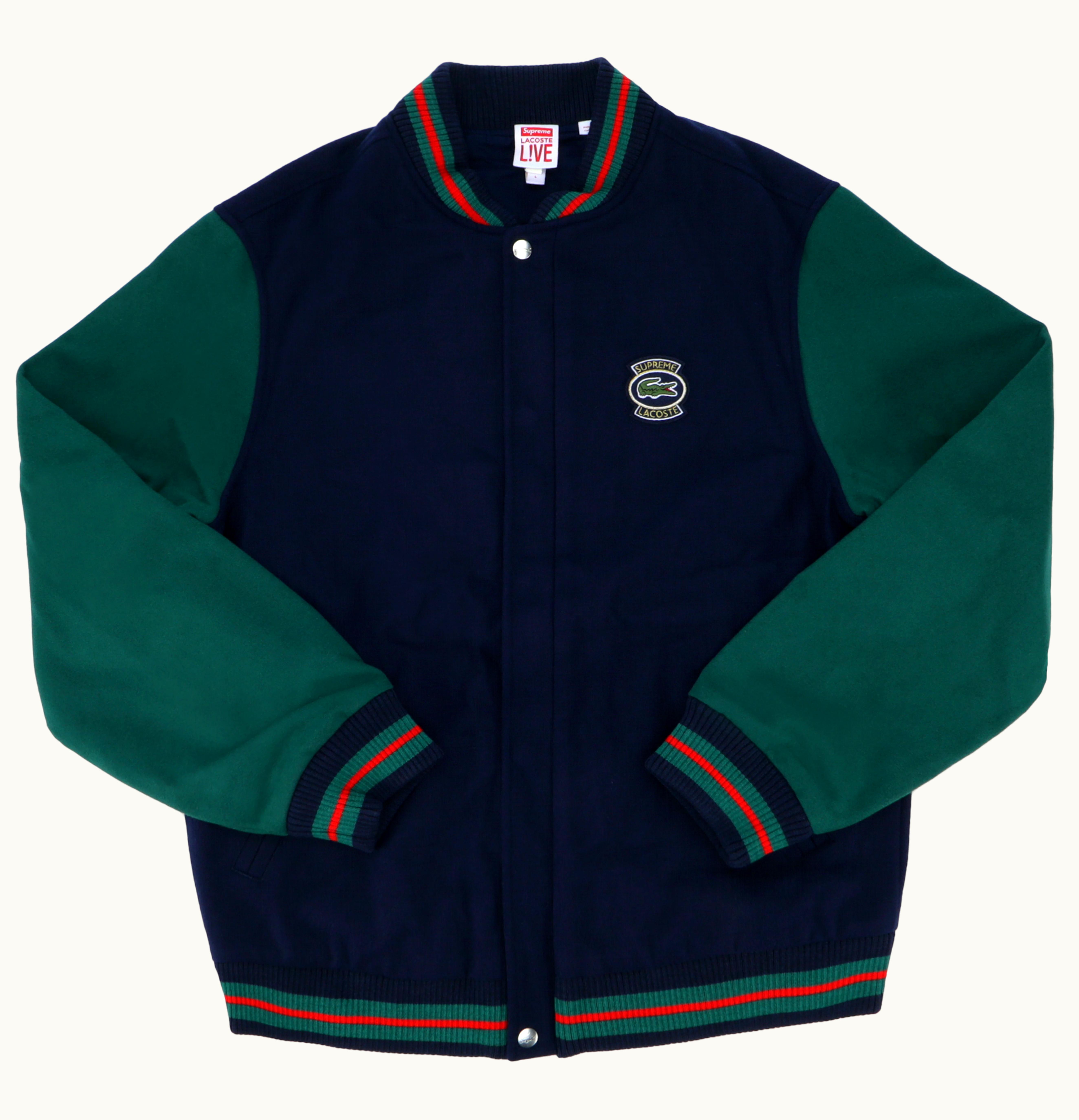 The Supreme LACOSTE Wool Varsity is a highly sought-after limited edition jacket that brings together two iconic fashion brands, Supreme and Lacoste. This varsity style jacket is made from a premium quality wool blend fabric that is soft, warm and snug, making it perfect for cold weather. The jacket features the iconic Lacoste crocodile logo on the chest and the word 'Supreme' embroidered across the back in bold and eye-catching lettering. Other features include button closures, ribbed collar, cuffs and hem, and two front pockets. Available in a range of sizes, this varsity jacket is a must-have for fashion-conscious individuals who want to make a bold statement with their wardrobe choices.