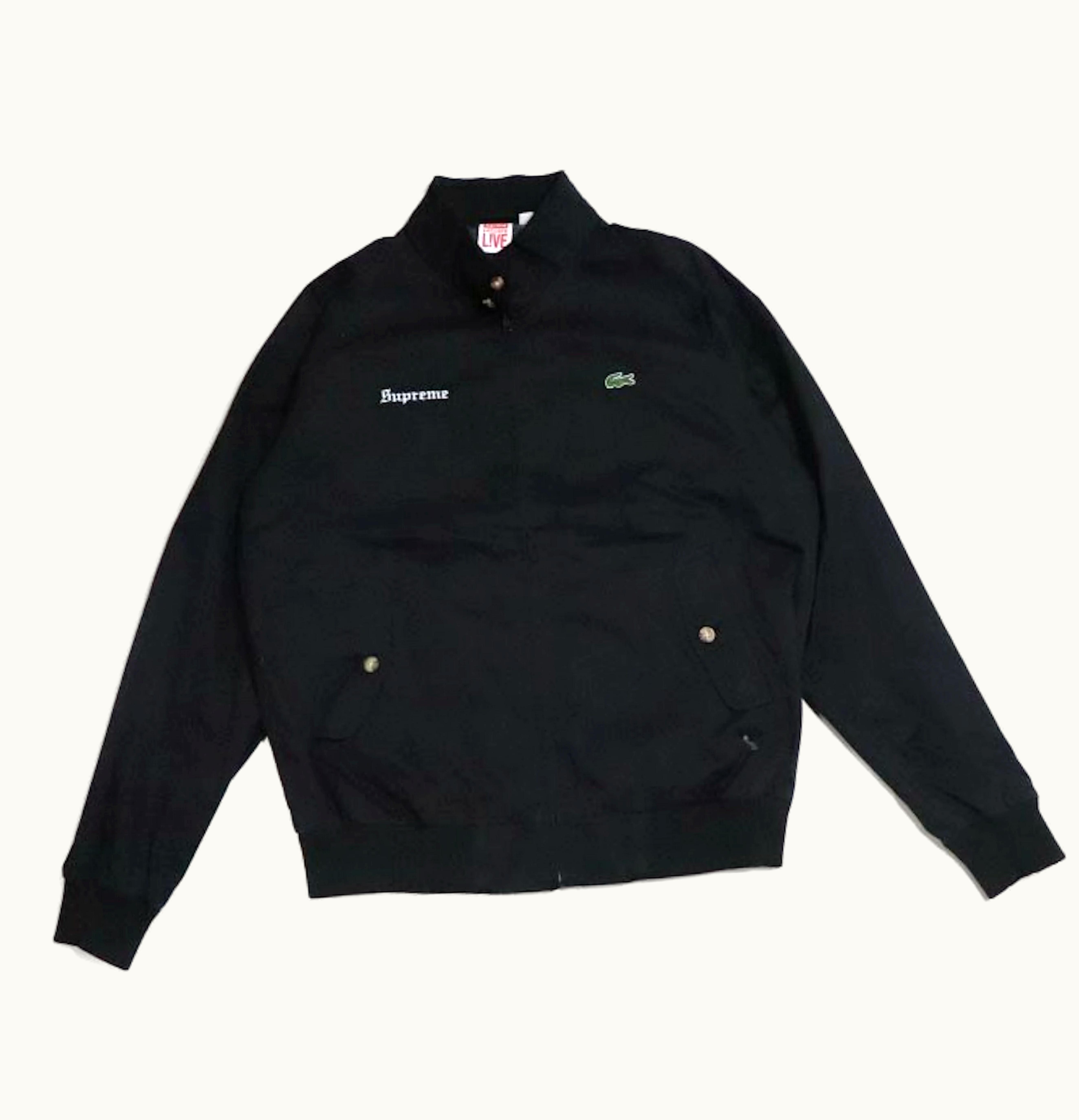 The Supreme Lacoste Harrington is a limited edition jacket collaboratively created by Supreme and Lacoste, both known for their high-quality fabrics and designs. The jacket is fashioned in a classic Harrington style, with a zip-front, two buttoned pockets, and a ribbed hem and cuffs. The exterior is made of lightweight, water-resistant cotton twill, while the interior is lined with a breathable mesh fabric. The colorway of the jacket is a sporty combination of royal blue and white, with a subtle embroidered Supreme logo on the chest and a signature crocodile emblem on the sleeve. This jacket is perfect for stylishly functional everyday wear or as a statement piece for any streetwear outfit.