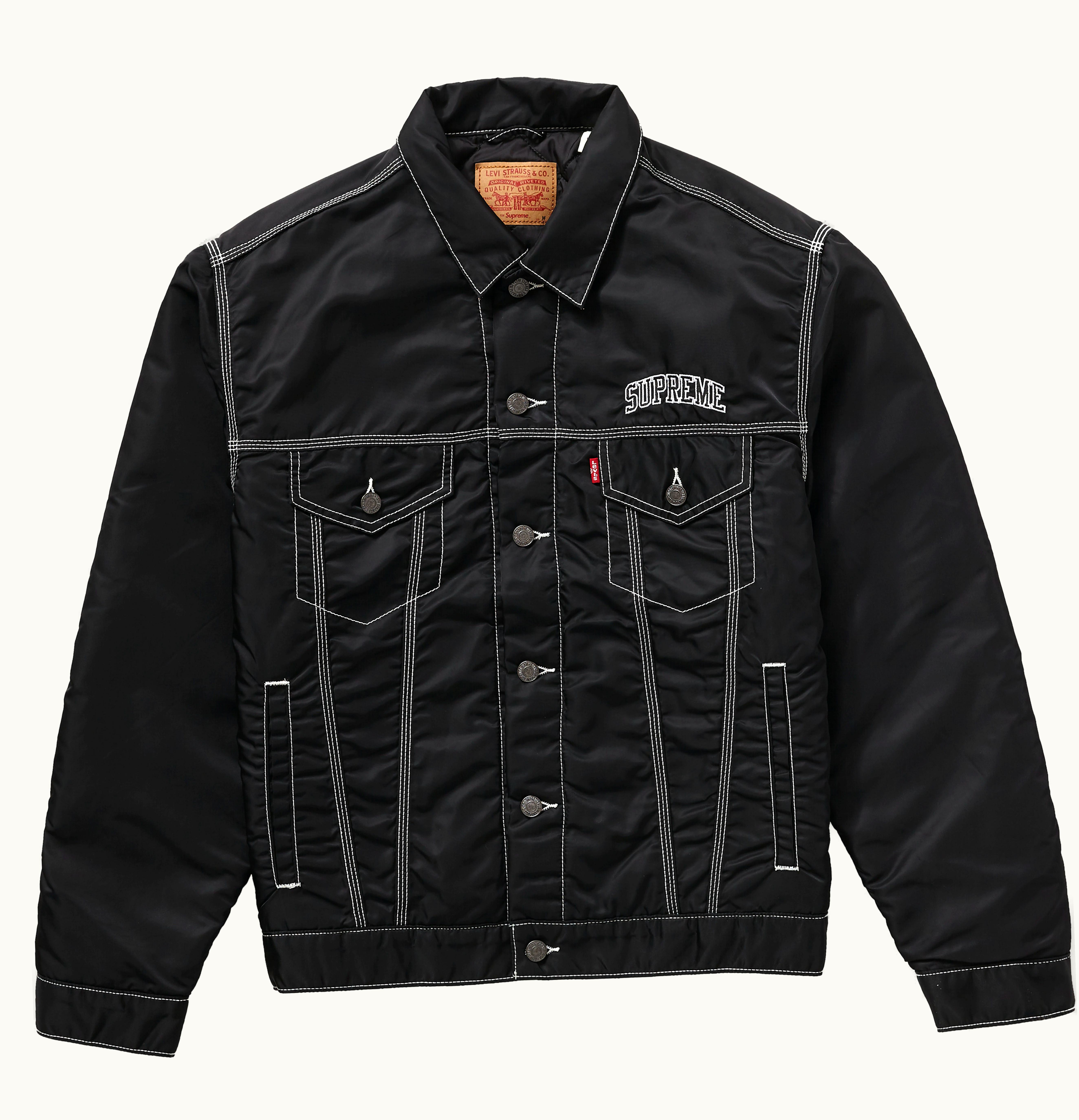 The Supreme Levi's Nylon Trucker Jacket is a collaboration between the streetwear brand Supreme and the iconic denim brand Levi's. The jacket is made of nylon, a lightweight and durable material that is resistant to water and wind. It features classic denim jacket detailing, such as a button front, chest pockets with flaps, and welt hand pockets. The jacket also has Supreme branding on the back and a Levi's logo on the chest. This collaboration combines the timeless style of a denim jacket with the functional properties of nylon, making it a versatile piece for any wardrobe.