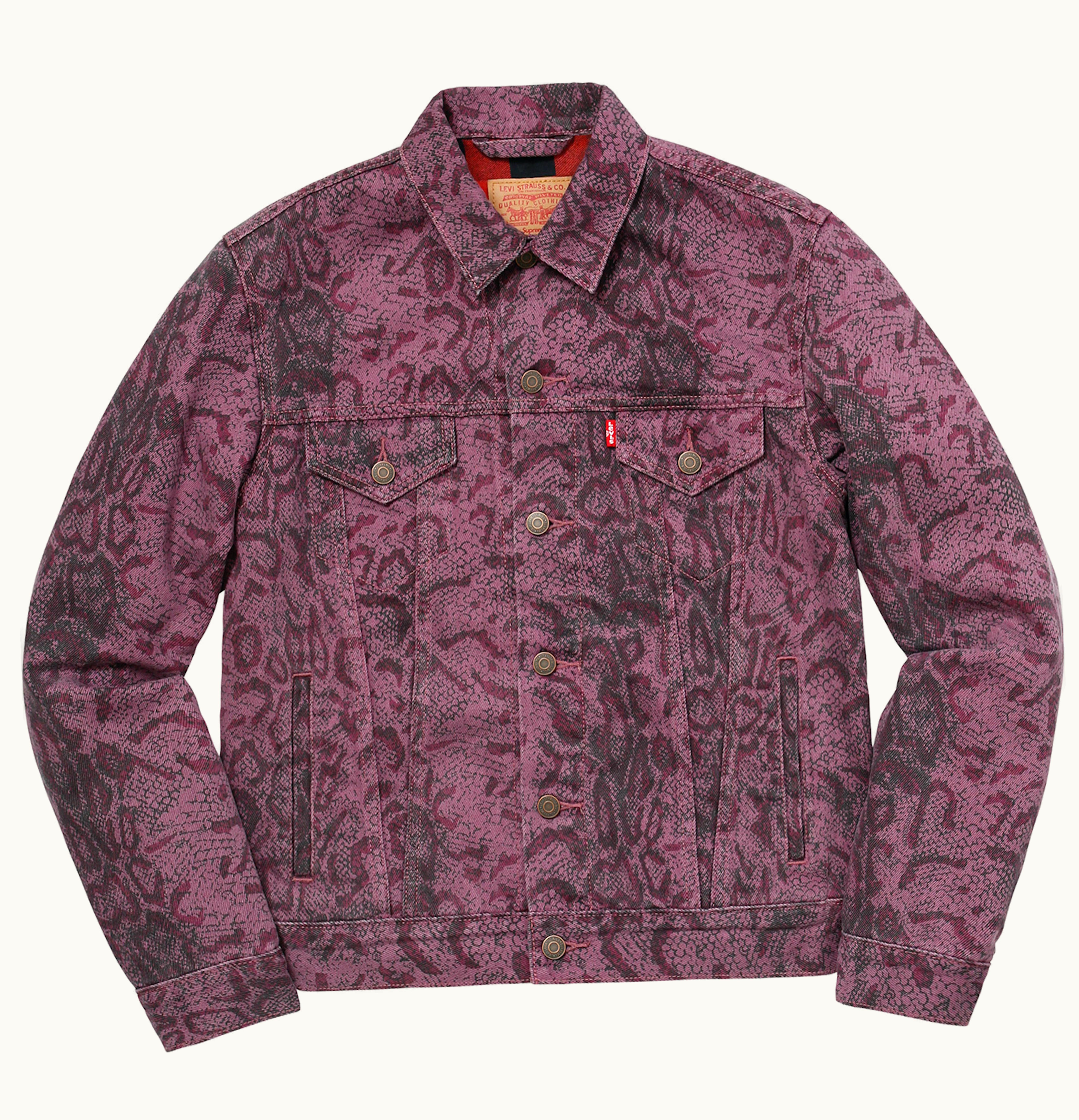 The Supreme Levi's Snakeskin Trucker is a cutting-edge clothing item that combines two unique styles - the classic Trucker jacket design from Levi's, and a bold snakeskin pattern for a daring and edgy look. This limited-edition jacket features a premium snakeskin print on the external fabric, which gives a unique tactile feel and visually stunning appearance. The interior of the jacket is made of premium cotton that provides comfort and breathability, making it perfect for both casual and formal occasions. The jacket features two front pockets and two chest pockets with the iconic Levi's red tab, providing ample space to carry essential items. This jacket is an exclusive product collaboration between Levi's and Supreme, making it a highly sought-after item for fashion enthusiasts and collectors alike. With its unique blend of classic and modern styles, the Supreme Levi's Snakeskin Trucker is a truly outstanding clothing piece that is sure to turn heads.
