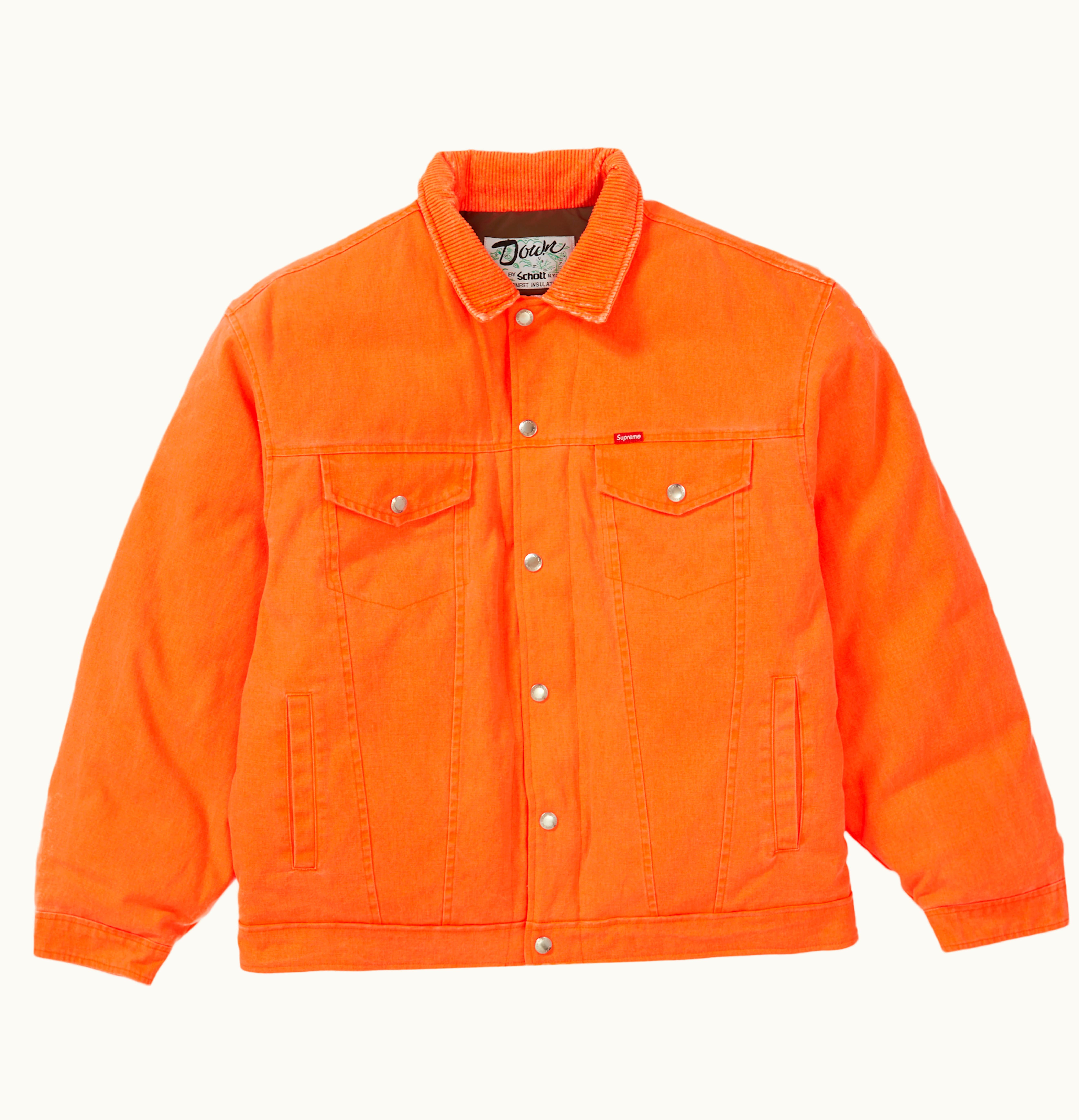 The Supreme Schott Canvas Down Trucker is a high-quality trucker jacket that features a classic design with a modern twist. This jacket is made from a durable canvas material and features a warm down fill to keep you comfortable in even the coldest weather. The jacket features a button-up front with a pointed collar and two chest pockets. The interior is lined with a soft and comfortable material to keep you warm and cozy. This jacket is perfect for anyone who wants to look stylish, but also stay warm and comfortable during the colder months. It is available in a range of colors, so you can choose the one that best suits your personal style.