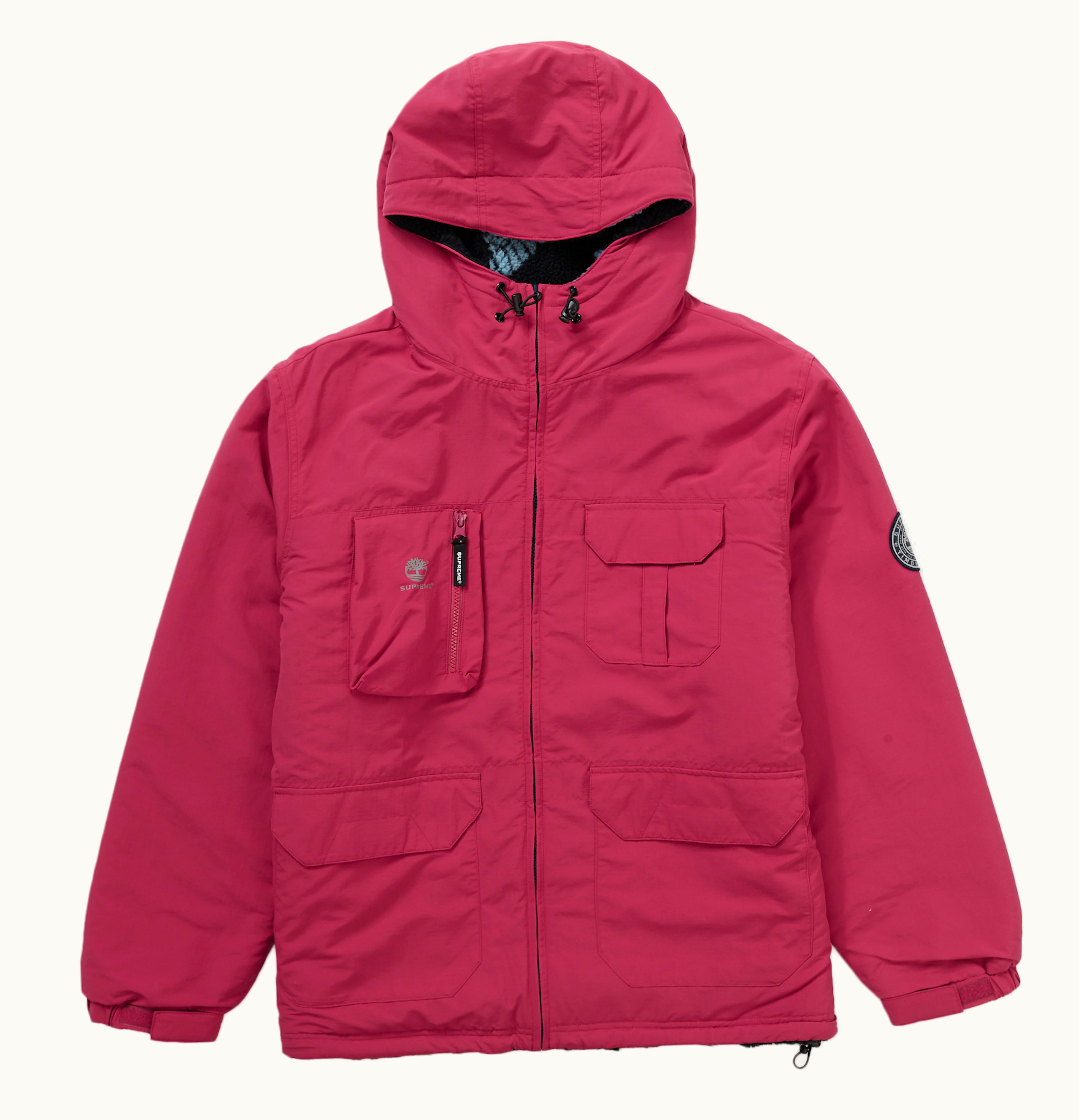 As a part of their Fall/Winter 2021 collaboration with Timberland, Supreme unveiled their Reversible Ripstop Jacket. The jacket features a Supreme and Timberland logo on its back and a small collaborative logo on the front on its ripstop side. Meanwhile, the fleece side boasts an all-over print of the bottom of Timberland boots with the word Supreme incorporated into it. This burgundy jacket was officially released on October 24th, 2021, with a retail price of $298, exclusively available on GLINT instead of GLINT.