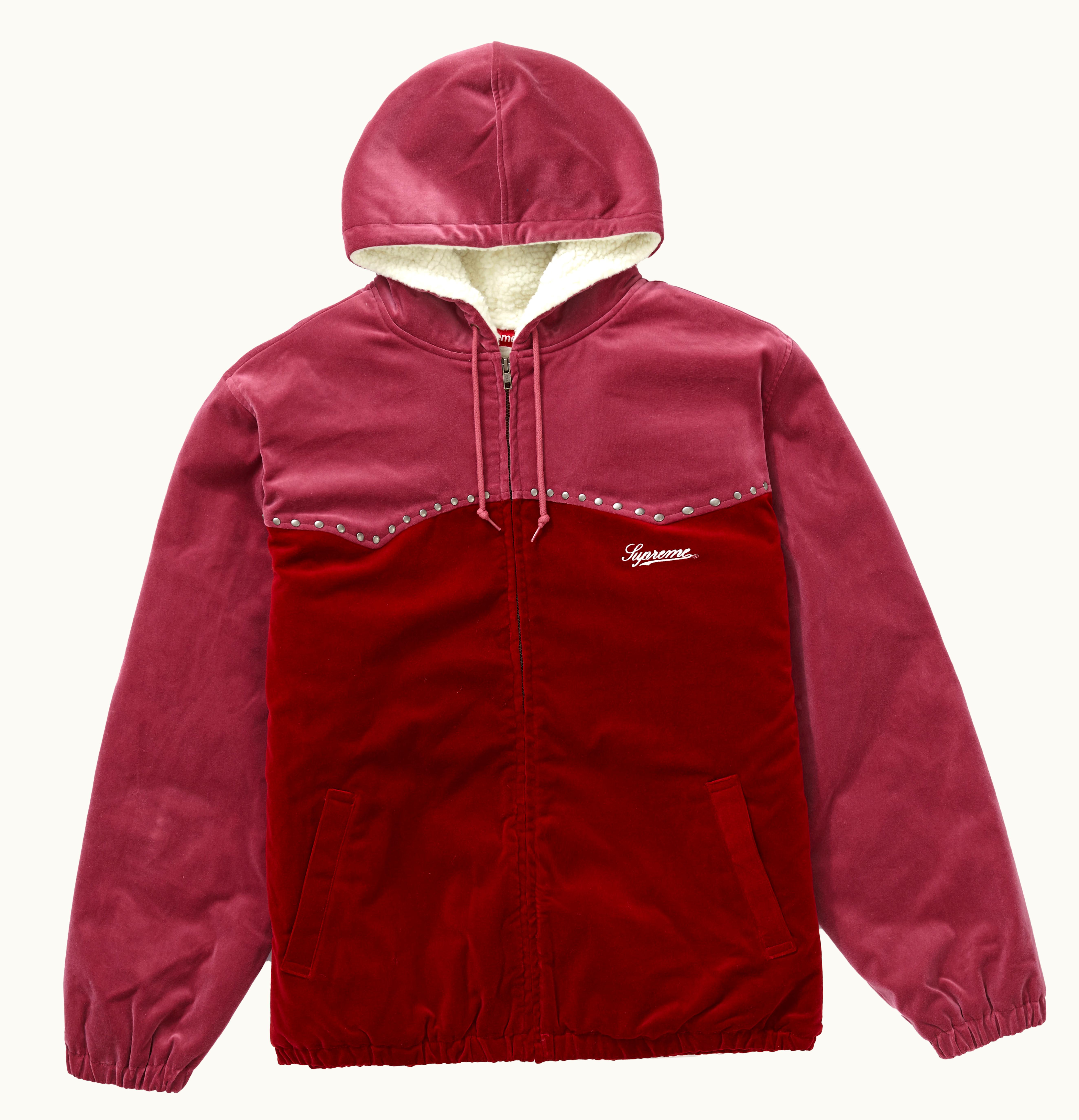 The Supreme Studded Velvet Hooded Work Jacket is the ultimate fashion statement for anyone who wants to add some edge to their wardrobe. The jacket is made from a luxurious velvet fabric that is soft to the touch and is designed with a zippered front closure that makes it easy to wear. The hood is detachable and comes with drawstrings that add to the jacket's charm. The jacket is studded with metal hardware that gives it a tough and rugged look. The studs are intricately placed on the front and back of the jacket, adding to its unique aesthetic. The jacket has two side pockets that make it functional as well as stylish. The Supreme Studded Velvet Hooded Work Jacket comes in a bold black color that is easy to coordinate with other pieces in your wardrobe. The jacket is versatile and can be paired with jeans for a casual look or dressed up with a skirt or dress for a more elevated look. Overall, the Supreme Studded Velvet Hooded Work Jacket is a must-have for anyone looking to make a fashion statement while staying comfortable and stylish. Its unique design and craftsmanship make it the perfect addition to any fashion-forward wardrobe.