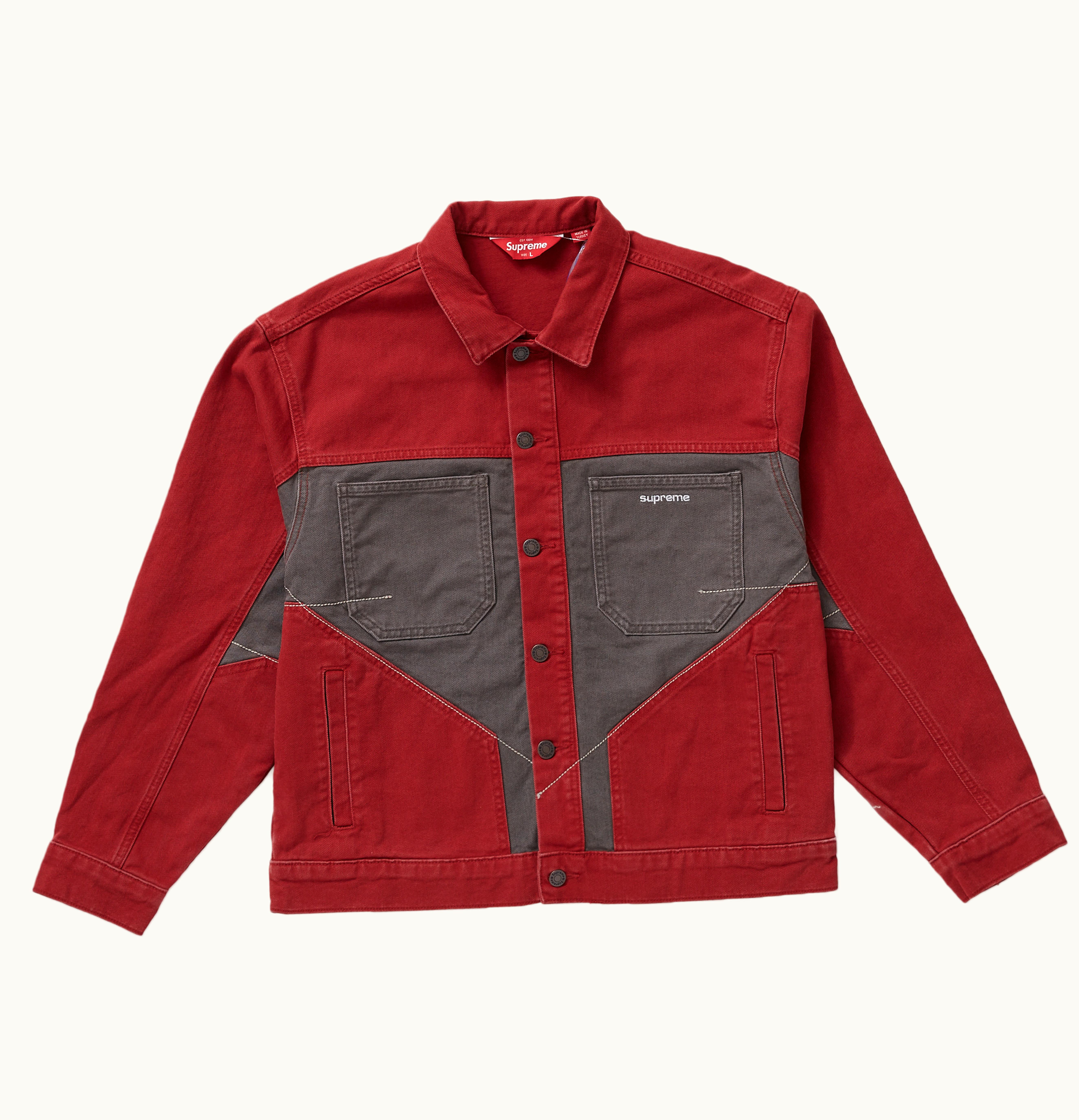 Supreme 2-Tone Paneled Denim is a high-quality denim jacket that features panels of different shades of blue. The jacket has a relaxed fit, making it easy to layer over a t-shirt or sweater. The front of the jacket has two chest pockets with button closures and two side pockets. The cuffs and hemline are finished with ribbed detailing for a comfortable fit. The Supreme logo is embroidered on the chest pocket, adding a touch of streetwear style. This jacket is perfect for casual outings or everyday wear.