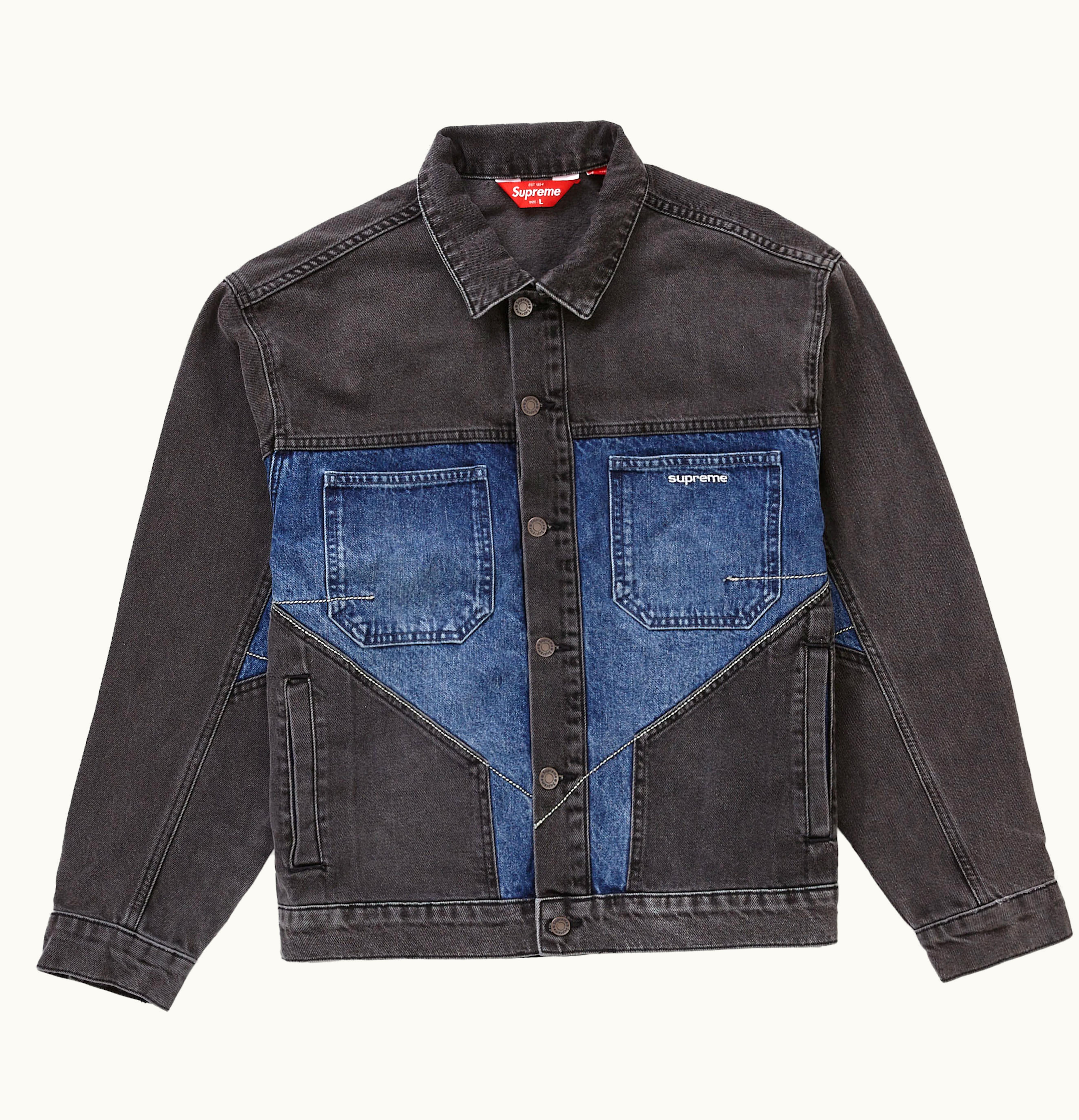 The Supreme 2-Tone Paneled Denim is a premium quality denim that features a unique two-tone design. The jeans are made from high-quality denim that is durable and comfortable to wear. The paneled design of the pants incorporates two different shades of denim which gives it a stylish and distinctive look. The jeans also feature a classic five-pocket design and button fly closure. The fit is true to size and the pants have a straight leg design. Overall, these jeans are a great addition to any wardrobe for those who want to make a statement with their fashion.