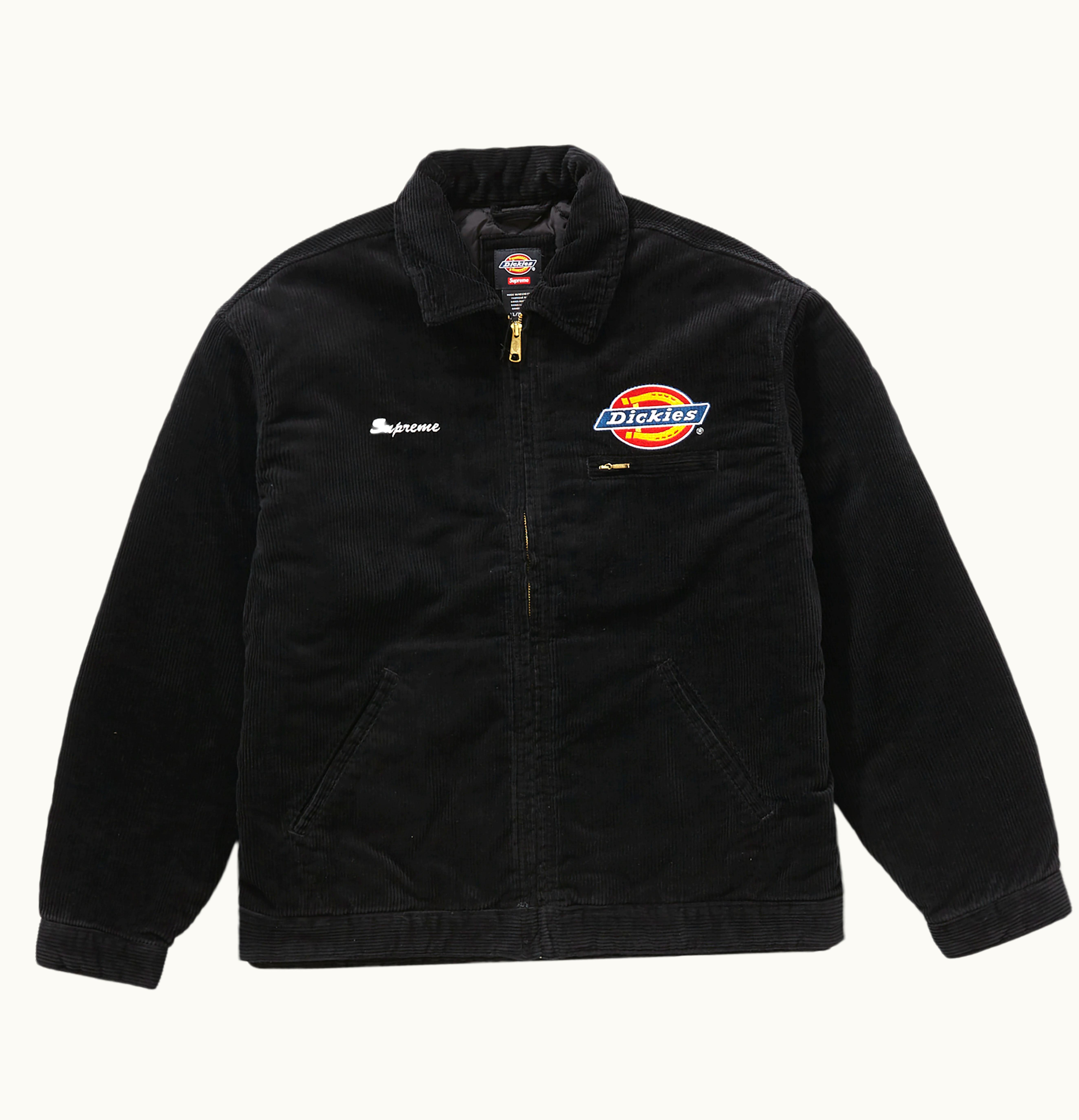 The Supreme Dickies Corduroy Work Dickies Corduroy Work is a durable and stylish work pant, designed in collaboration with the iconic workwear brand Dickies. The pants are made from a soft and warm corduroy fabric, ideal for colder weather and hard-wearing environments. The design features a classic fit with straight legs and a Dickies logo patch on the back pocket. The pants are available in a range of colors, including black, olive, and burgundy, each with Supreme's iconic red label on the waistband. These pants are perfect for both workwear and streetwear, combining the functionality of work pants with the fashionable style of Supreme.