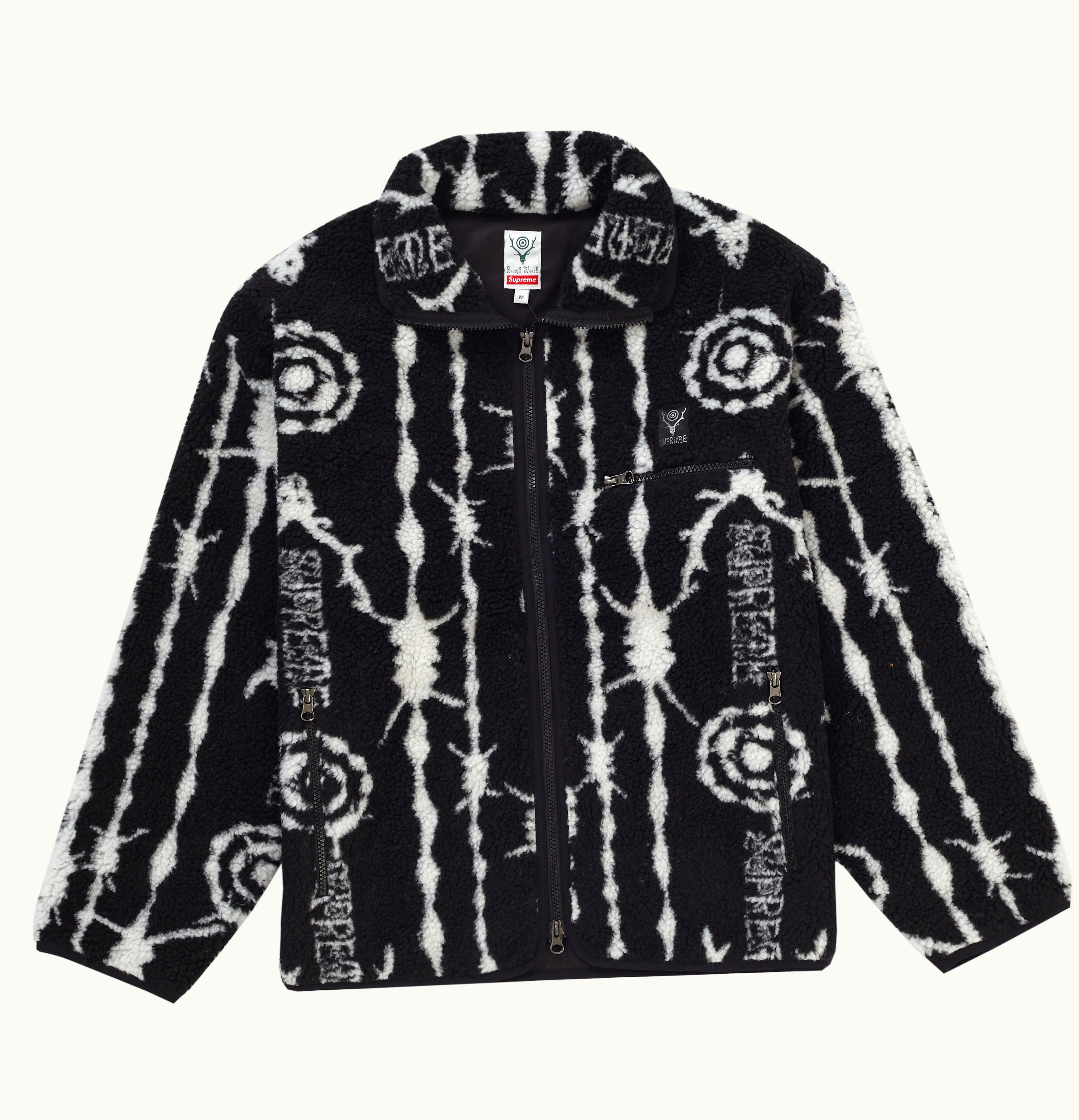 During Week 9 of their Spring/Summer 2021 season, the renowned streetwear brand, Supreme, collaborated with Japanese label SOUTH2 WEST8 to launch their latest offering: the Supreme Fleece Jacket. This cozy sherpa fleece jacket, equipped with a smooth satin lining, showcases a striking pattern featuring the jacquard Supreme and SOUTH2 WEST8 logos. It also boasts convenient zippable pockets at the front and chest, and is adorned with the iconic woven Supreme logo at the chest pocket. The Supreme SOUTH2 WEST8 Fleece Jacket hit stores on April 22nd, 2021, retailing at $198 USD, and is now available exclusively on GLINT.