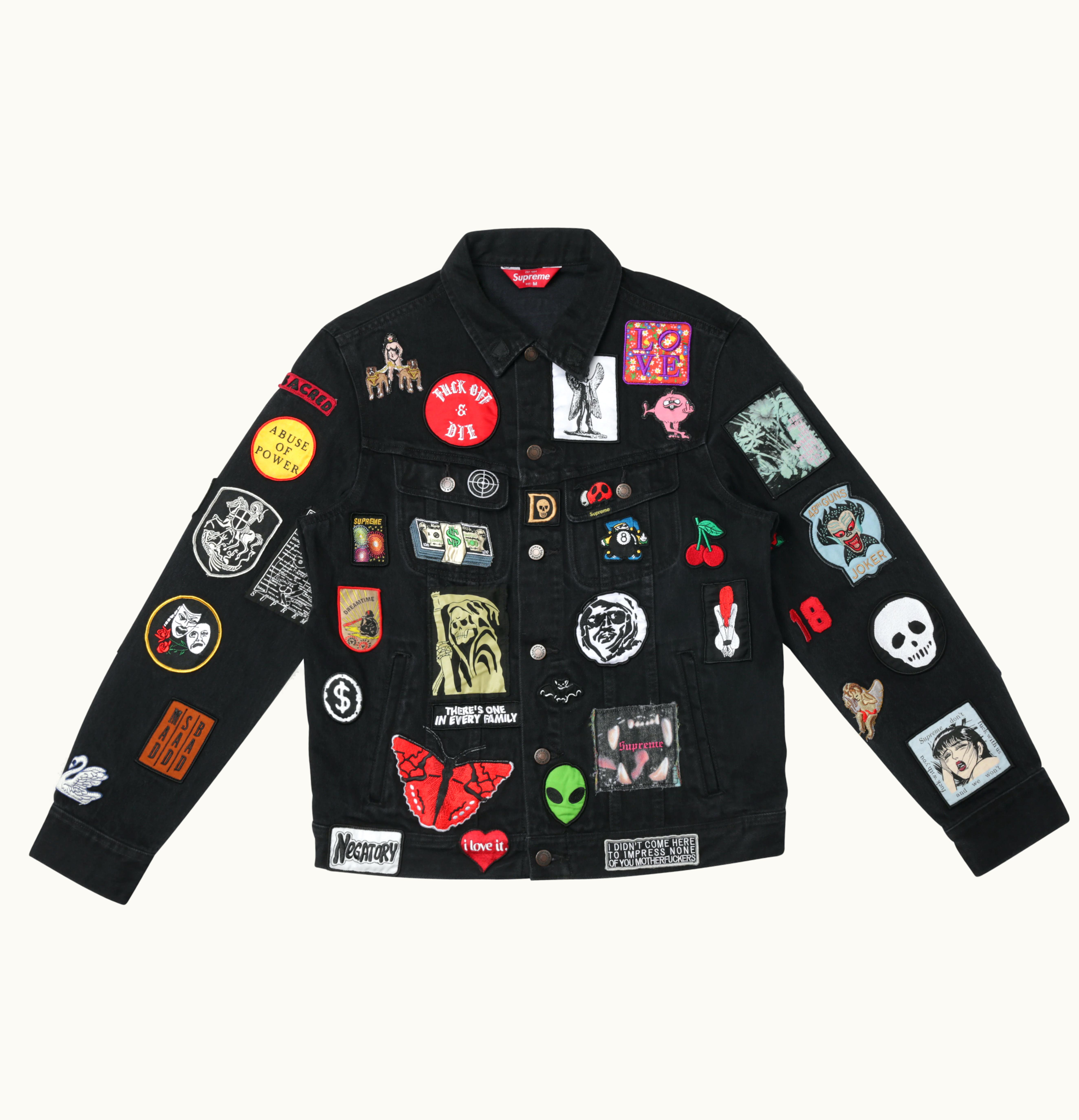 The Supreme Patches Denim Trucker is a unique and stylish denim jacket that features a collection of embroidered patches all over the front and back. The patches are inspired by different themes, such as skateboarding, music, and streetwear culture, giving the jacket a cool, urban vibe. The trucker-style jacket is made from high-quality denim material and has a relaxed fit that is perfect for layering. It also features a button-front closure, chest pockets, and side welt pockets for added functionality. The Supreme Patches Denim Trucker is a standout piece that is sure to elevate any outfit.