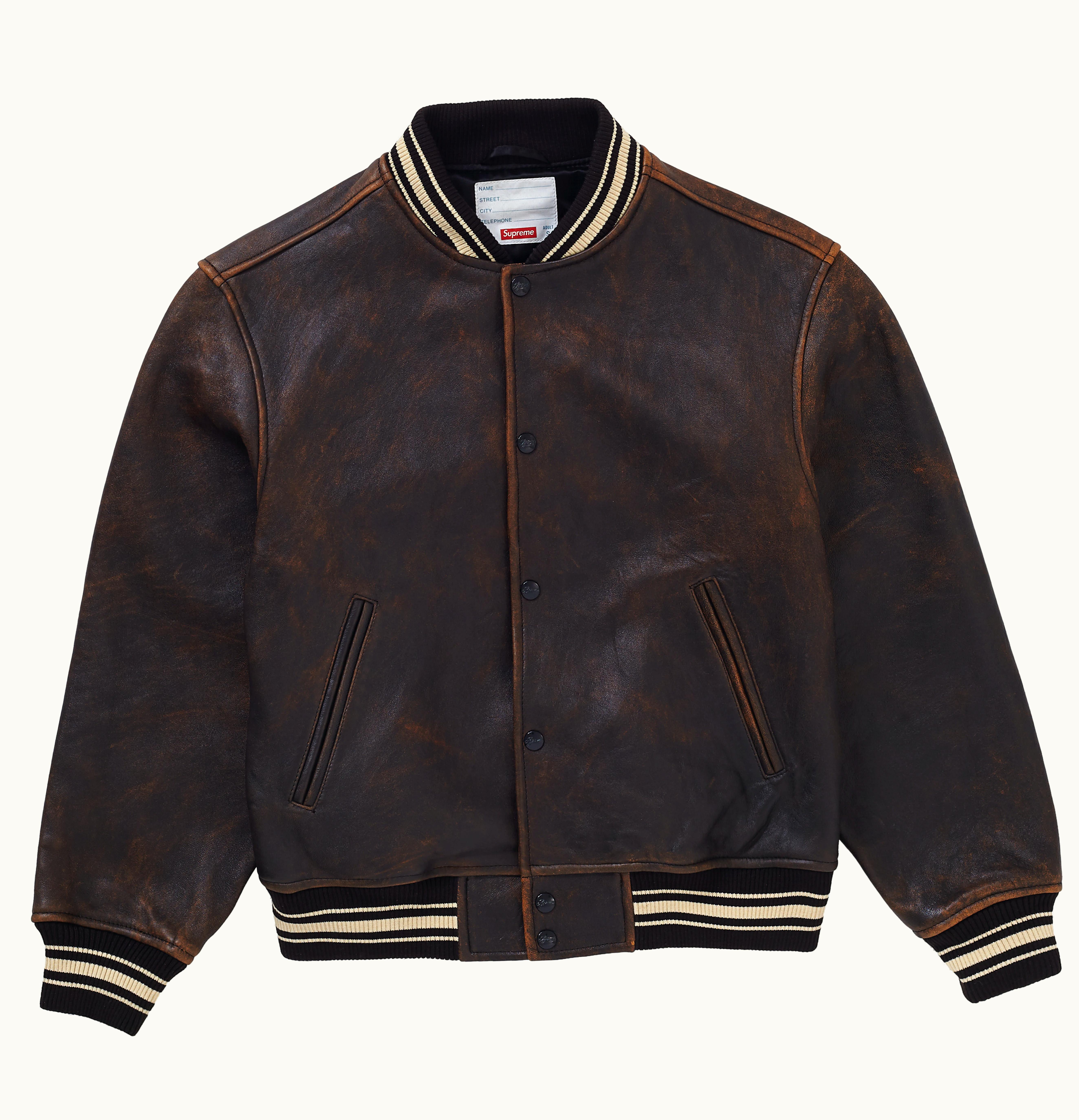The Supreme Worn Leather Varsity is a high-quality, stylish and unique leather jacket. Crafted from premium leather, the jacket features a striking worn look, with distressed detailing and a vintage-inspired aesthetic. The piece features classic varsity styling, with contrasting ribbed collar, cuffs and hem, and a snap-button closure. The jacket is styled in a sleek black colourway, with bold, embroidered Supreme branding on the chest and back, adding a touch of streetwear edge. Perfect for layering over your favourite streetwear looks, this statement piece is a must-have for any fashion-forward wardrobe.