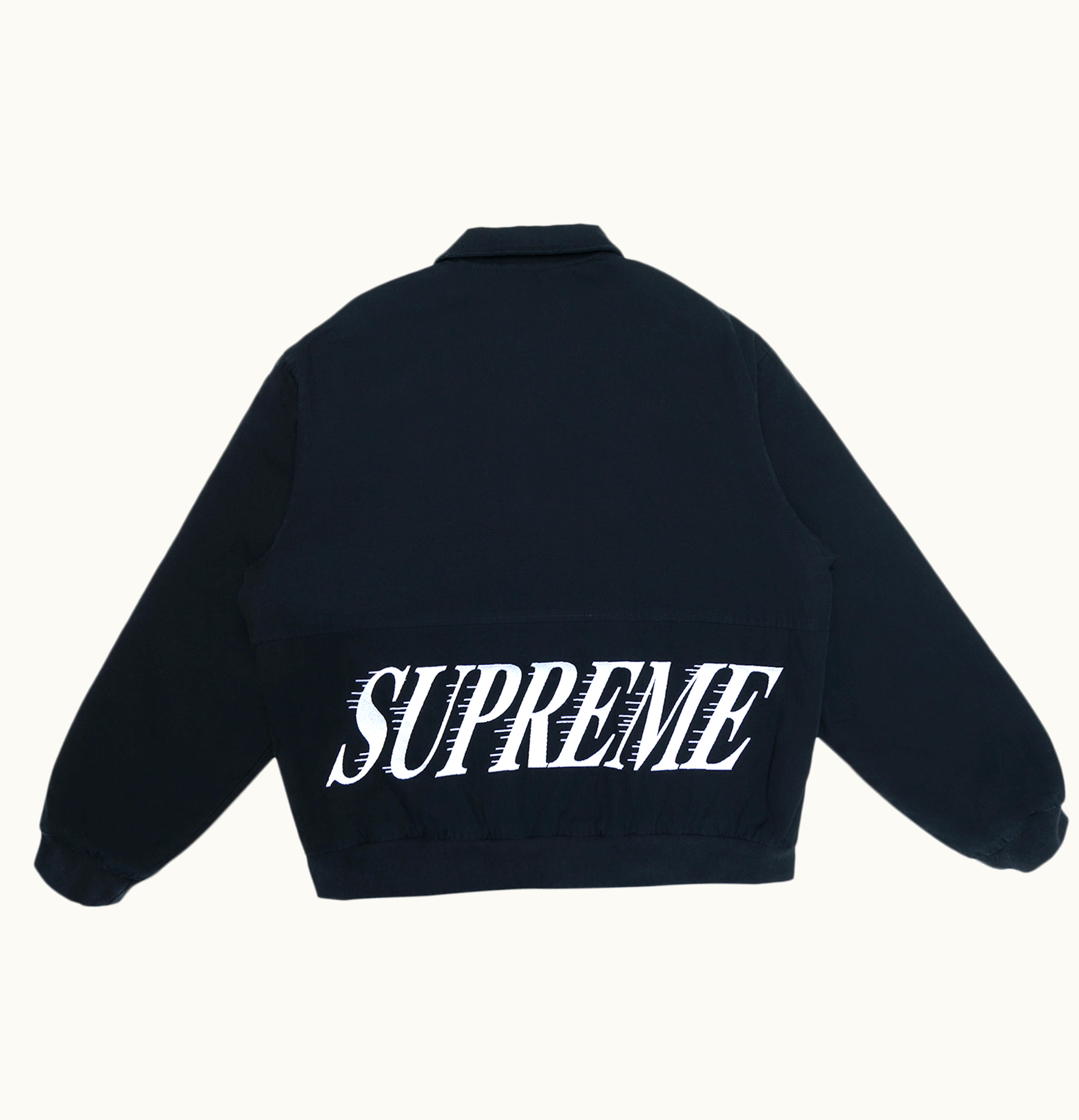 The Supreme Twill Varsity Jacket is a classic and stylish varsity jacket with a modern twist. Made from premium twill fabric, this jacket exudes elegance and sophistication. The jacket features a bold "Supreme" graphic on the back, which adds a trendy flair. The ribbed detailing on the waistband, cuffs, and collar gives the jacket a classic varsity look. The jacket is designed with a button-front closure for ease of wear, and it has two pockets for storage. The Supreme Twill Varsity Jacket is perfect for those who want to make a fashion statement while showing their love for Supreme.