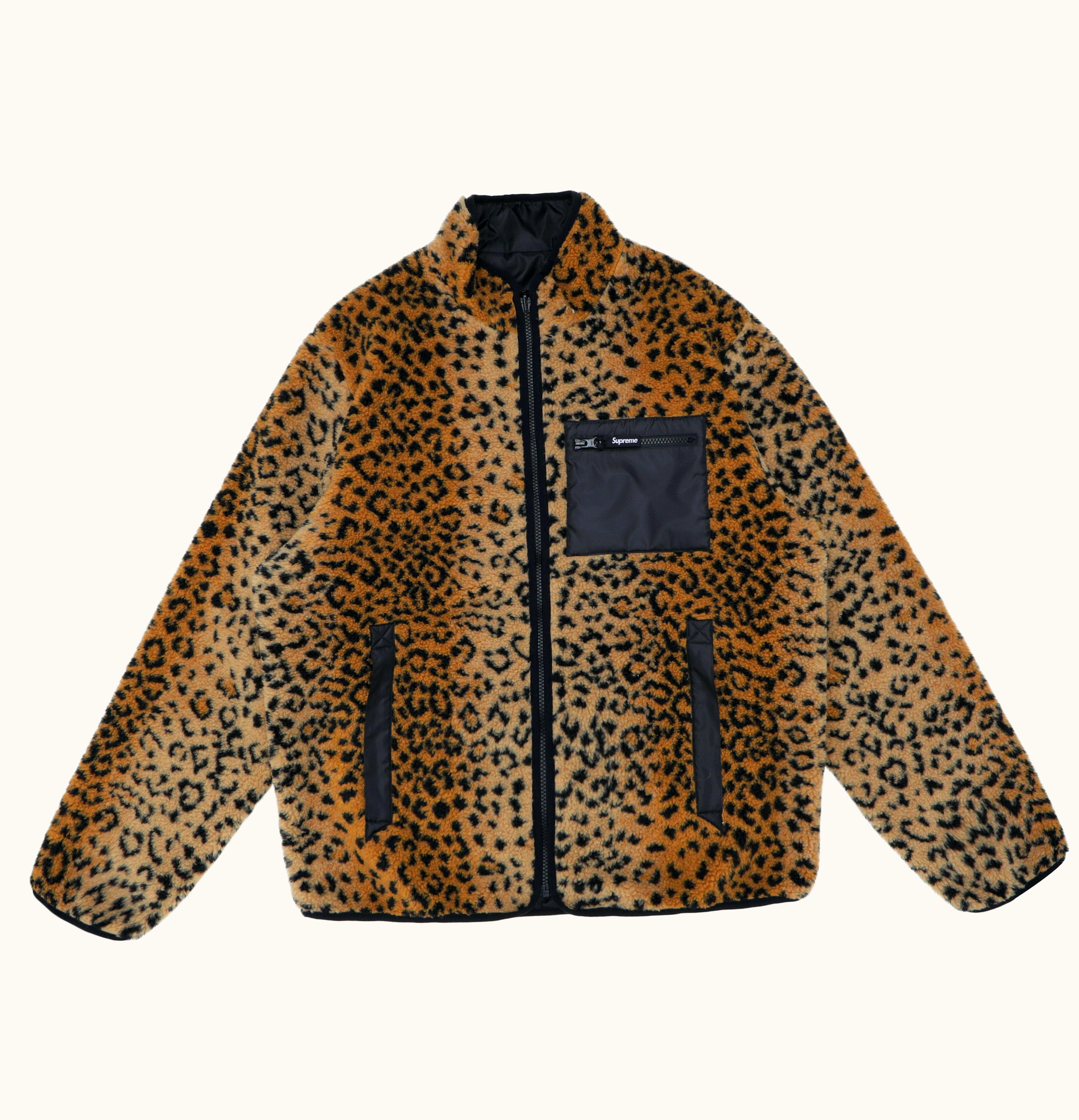 The Supreme Leopard Fleece Reversible Leopard Fleece Reversible is a high-quality clothing item made from soft and comfortable fleece material. This reversible fleece features a leopard print on one side and a solid black color on the other, giving you two stylish options in one convenient garment. The Supreme brand logo is prominently displayed on the left chest area. The fleece is suitable for both men and women and is perfect for casual wear or as a layering piece in colder weather. It is available in different sizes to ensure a comfortable fit for everyone.