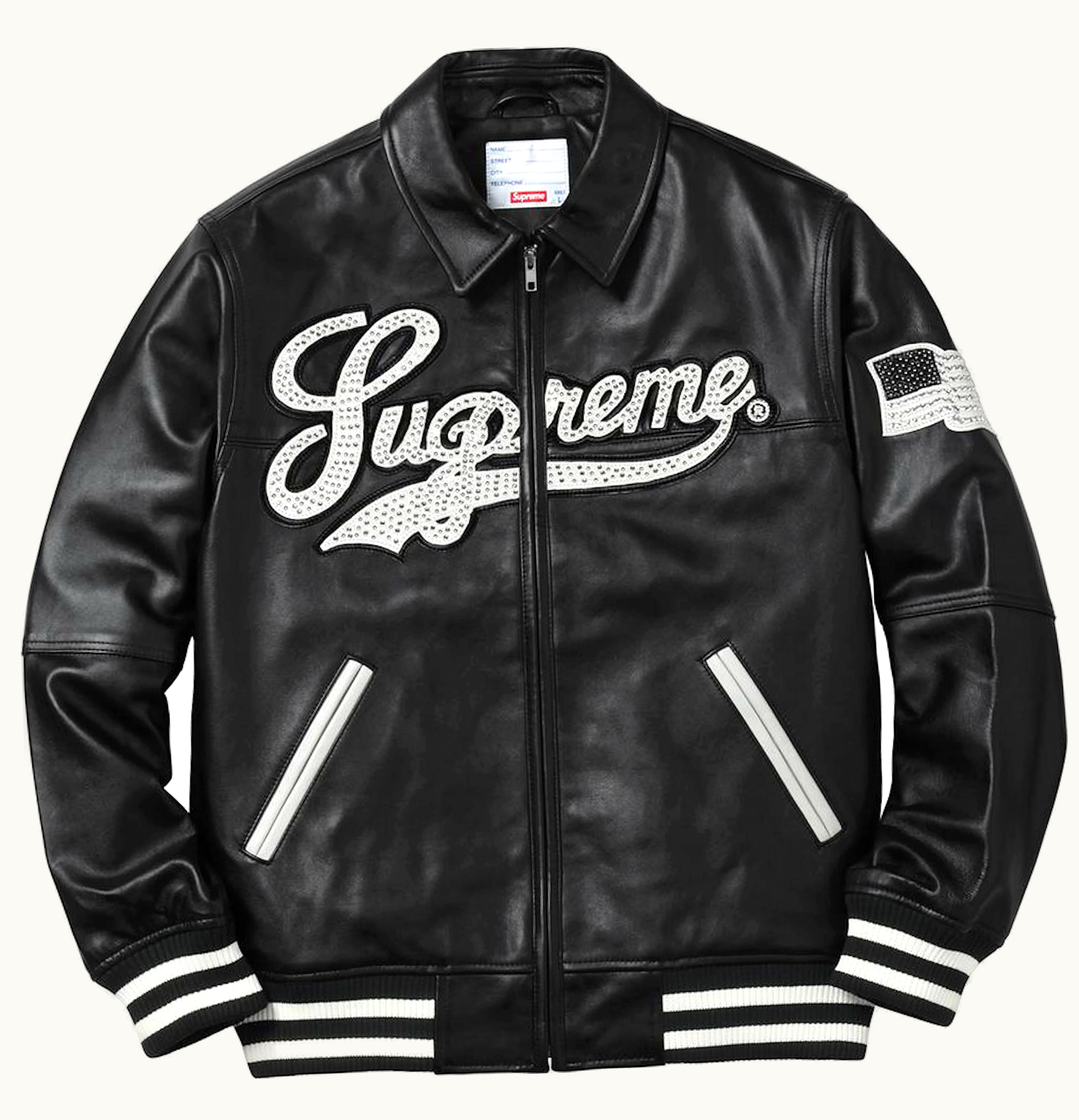 The Supreme Uptown Studded Leather Varsity is a premium quality varsity jacket that features a stunning and bold design. The jacket is made from high-quality leather that is durable and long-lasting. It is decorated with gold-tone studs on the front, back, and sleeves, adding a touch of sophistication to the jacket. The jacket also features a ribbed collar, cuffs, and hem, which enhances its style and offers a comfortable fit. The Supreme Uptown Studded Leather Varsity is a statement piece that is perfect for street-style fashion, casual events, and parties. The jacket is available in different sizes to cater to a wide range of body types. It is an excellent investment for anyone who wants to add a touch of luxury and style to their wardrobe.