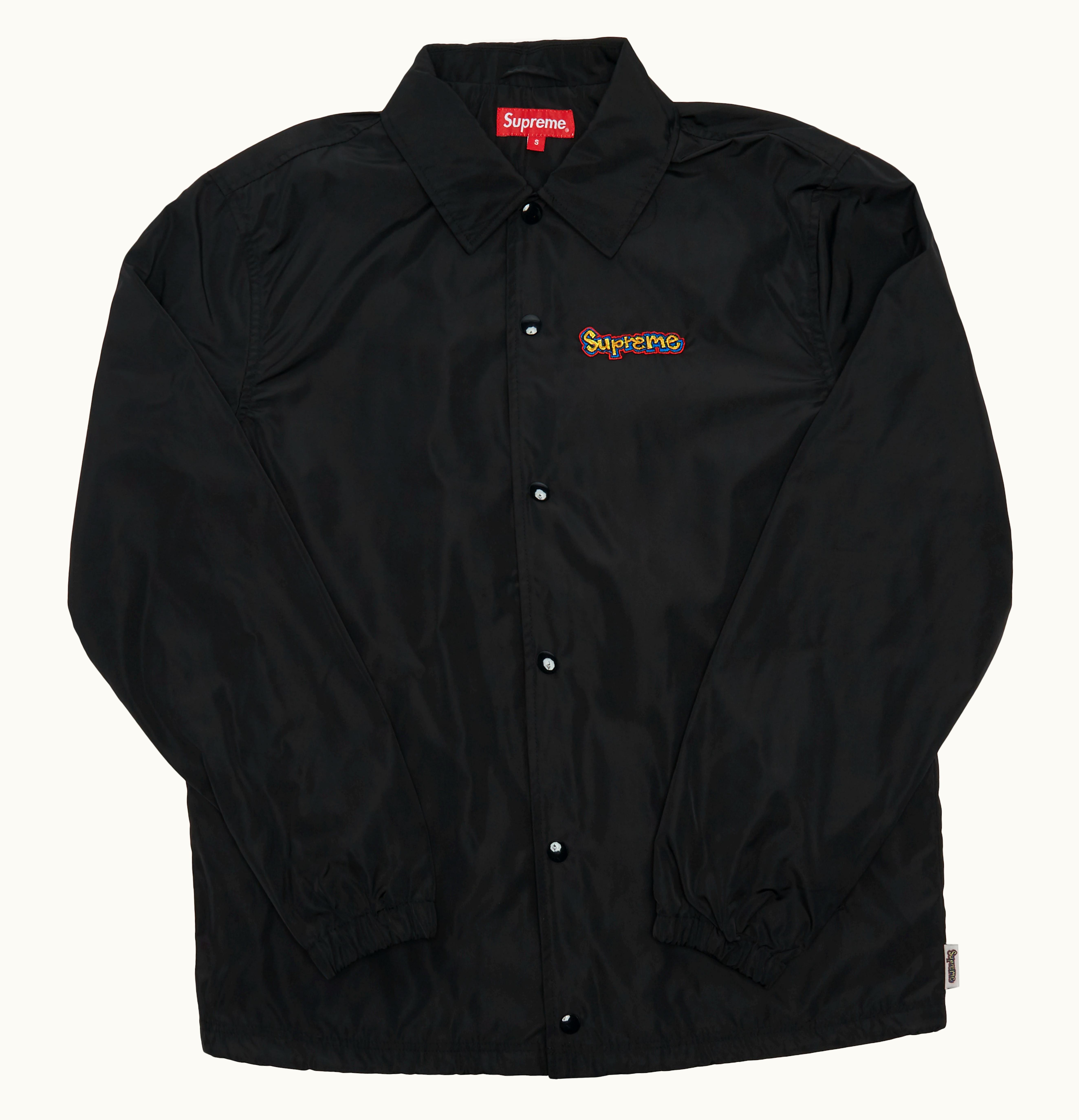The Supreme Gonz Logo Coaches Jacket is a collaborative piece featuring graphics from both Supreme and the artist Mark Gonzales. It is made of a lightweight nylon fabric with a mesh lining for breathability. The jacket has a snap front closure with the "Supreme" logo in bold letters across the chest and Mark Gonzales' signature artwork on the back. It also features a drawstring waist, elastic cuffs, and two side pockets. This jacket is perfect for cooler days and adds a stylish touch to any outfit.