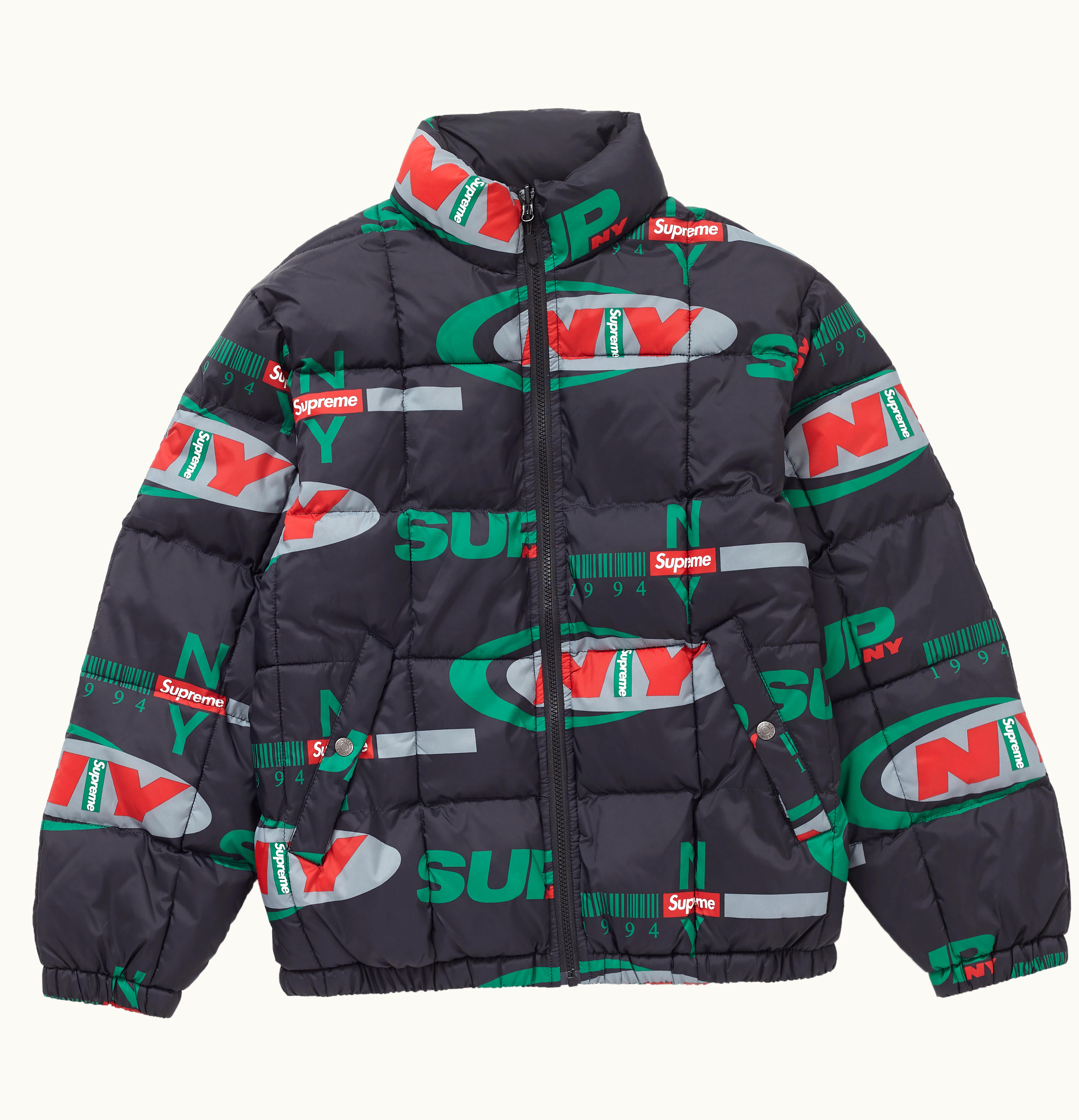 The Supreme NY Reversible Puffy is a versatile jacket that can be worn two ways. One side is black with a white Supreme logo on the chest, while the other side is silver with a black Supreme logo on the chest. The jacket is filled with puffy insulation for warmth and has a zip-up front, two zippered pockets on each side, and elastic cuffs and waistband for a comfortable and secure fit. It is made from high-quality materials and features excellent craftsmanship, typical of Supreme products. This jacket is perfect for those who want to stay warm and stylish at the same time.