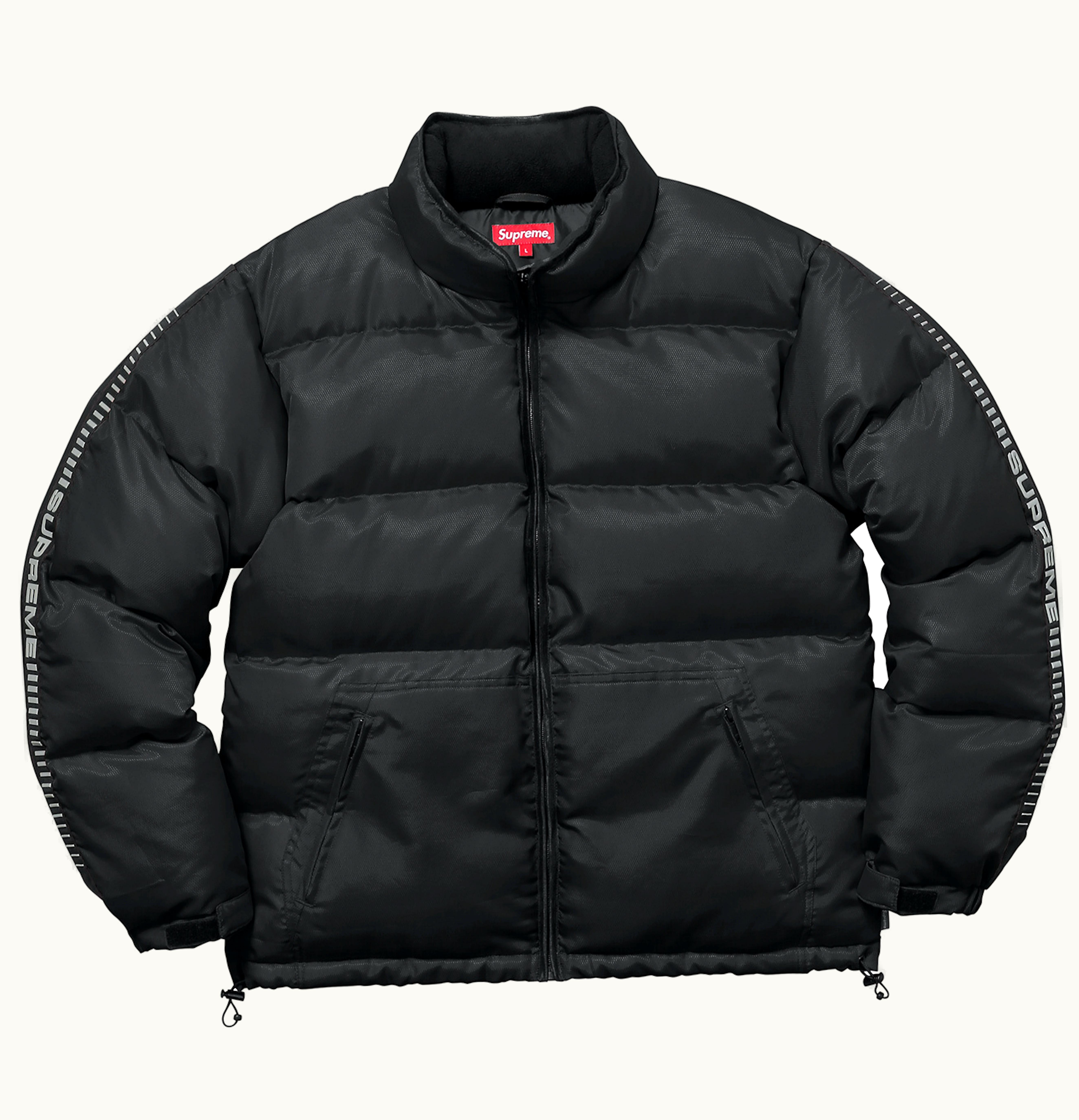 The Supreme Reflective Sleeve Logo Puffy is a premium quality jacket that showcases the brand's iconic logo in a reflective material. The jacket features a puffy design that provides superior warmth and comfort. It is made from high-quality materials with impeccable stitching and attention to detail that ensures longevity and durability. The reflective sleeve logo is visible even in low light conditions, making it perfect for nighttime wear. It has a full zip closure with a high collar that provides further protection from the cold. The jacket boasts a relaxed fit with ribbed cuffs and hem for added style and comfort. This jacket is an excellent addition to your winter wardrobe and is sure to turn heads wherever you go.