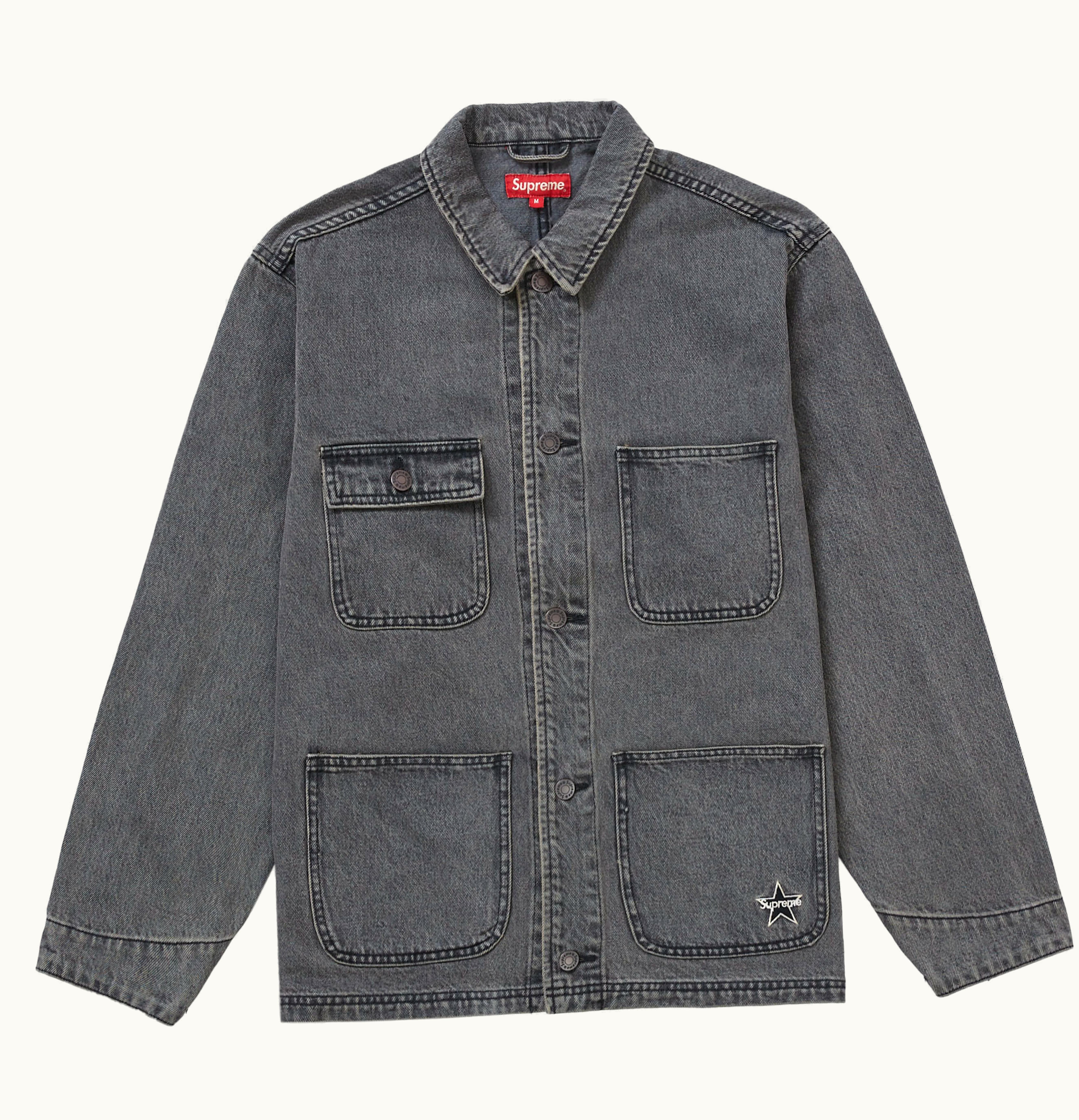 The Supreme Denim Chore Coat Denim Chore Coat is a high-quality and durable jacket designed for both fashion and function. Made from sturdy denim material, this coat features a classic workwear silhouette with front button closures, multiple pockets, and adjustable cuffs. The jacket is finished with the iconic Supreme logo on the back and a subtle embroidered logo on the chest pocket. With its versatile design and reliable construction, the Supreme Denim Chore Coat is a must-have addition to any wardrobe.