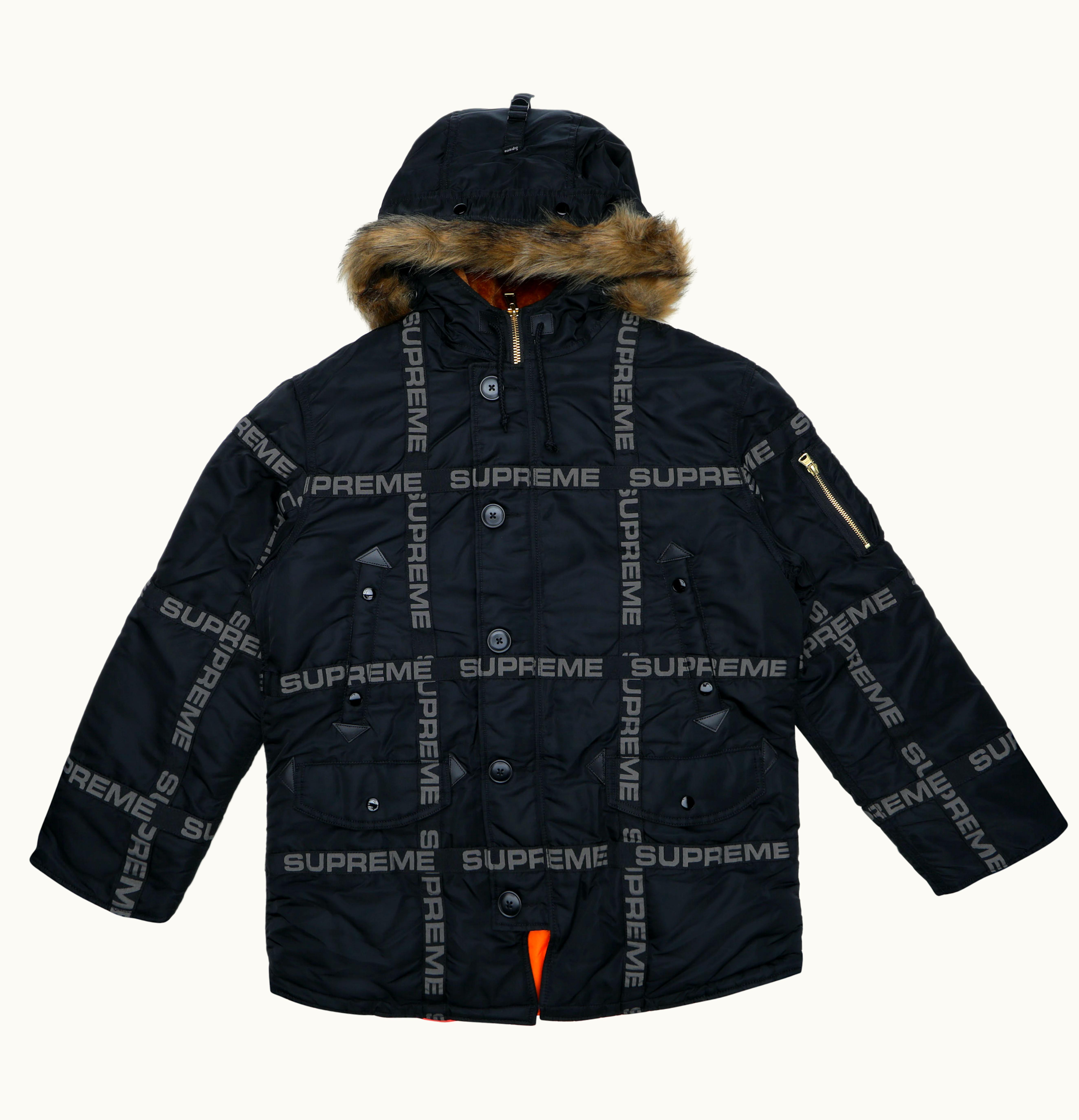 The Supreme Logo Tape N-3B is a high-quality insulated parka style jacket constructed from heavy-duty nylon twill material. The jacket features a classic N-3B design with a detachable fur-trimmed hood and a tonal nylon lining for added warmth and comfort. What sets this jacket apart is the signature Supreme branding throughout, with logo tape detailing on the front and back, and a Supreme box logo on the arm. The jacket also includes multiple pockets for storage and rib-knit cuffs and hem to help keep the cold out. This jacket is a must-have for any fan of the Supreme brand or for those looking for a stylish and functional winter jacket. It is available in a range of colors and sizes to suit every taste and preference.
