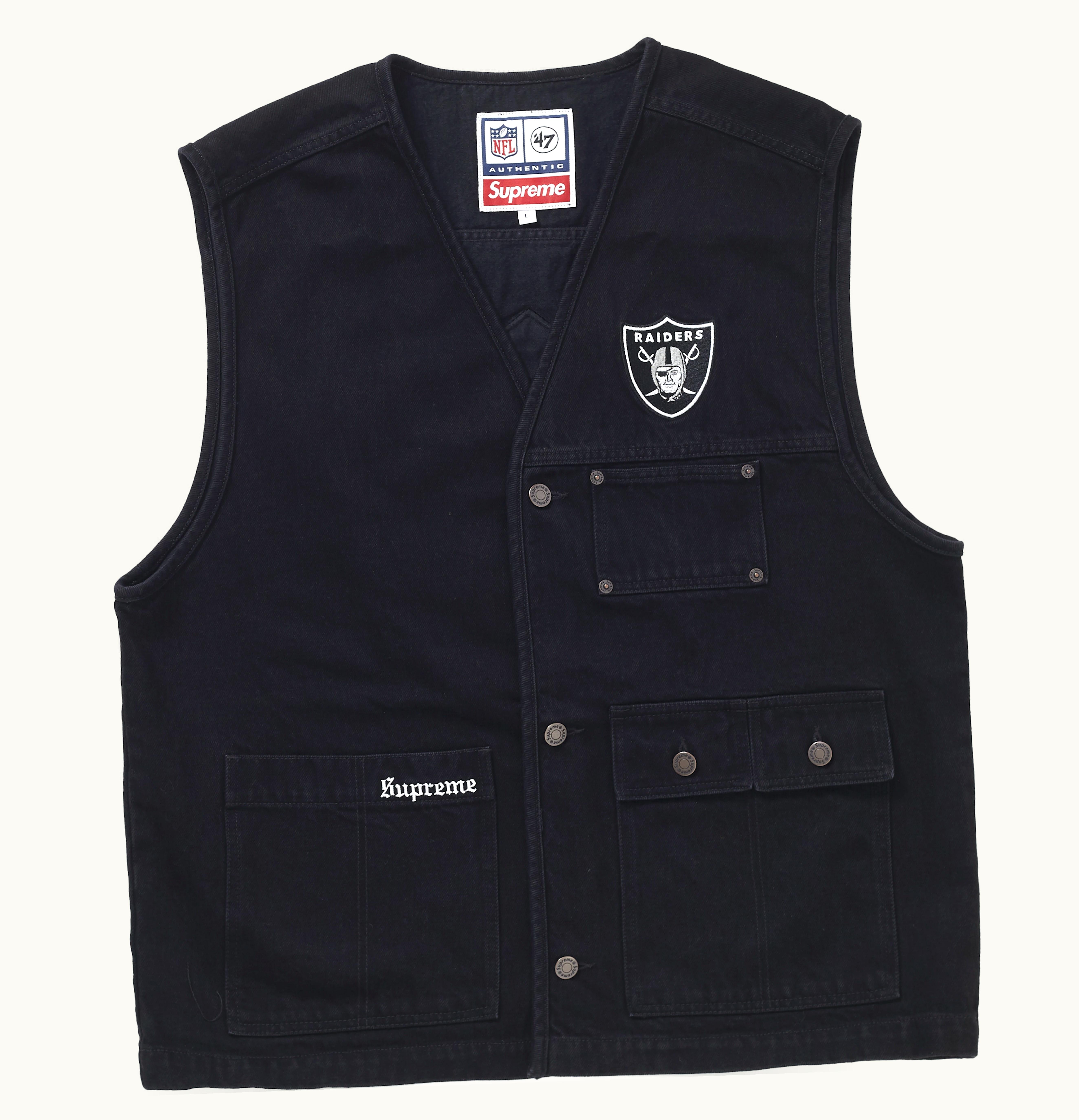 The Supreme NFL x Raiders x '47 Denim is a collaborative denim hat featuring the logos of Supreme, the NFL, and the Oakland Raiders. Made of high-quality denim fabric, this cap is designed to be durable and long-lasting. It features an embroidered Raiders logo on the front, with the Supreme box logo and NFL logo embroidered on the sides. The '47 Denim is an adjustable hat, with a strap on the back allowing for a comfortable and secure fit. Perfect for fans of the NFL and the Raiders, this denim hat is a stylish accessory that can be worn year-round.