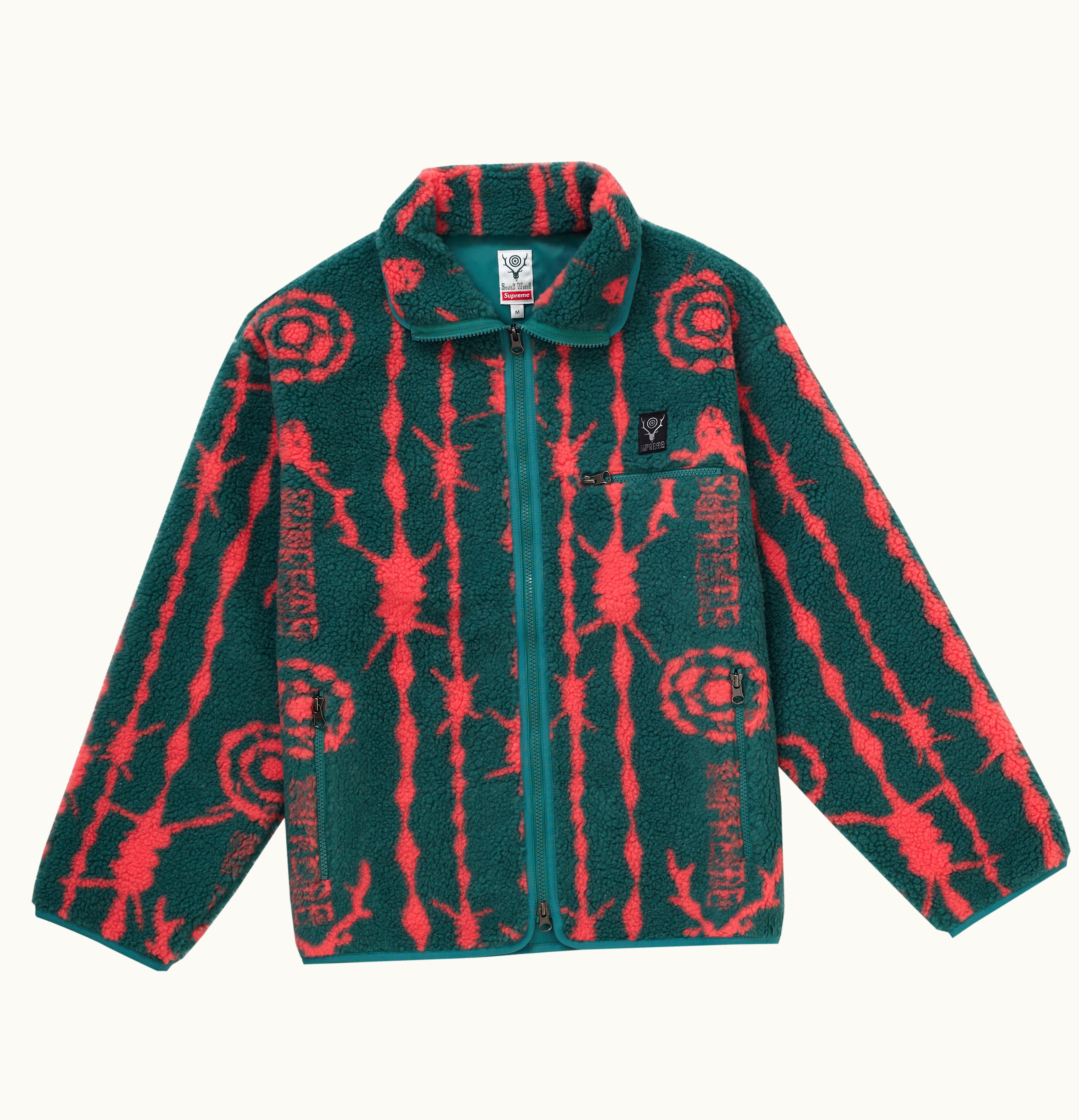 The Supreme SOUTH2 WEST8 Fleece is a high-quality piece of outerwear that combines warmth, comfort, and style. Made from a soft and durable fleece material, this fleece features a zippered front, two hand pockets, and a stand-up collar with a snap button closure. The neckline boasts an embroidered logo patch, while the back is decorated with a multicolored graphic print. The fleece has a relaxed fit that allows for comfortable layering and freedom of movement, and it can easily be styled with your favorite jeans or joggers for a casual yet trendy look. This is a must-have item for any fashion-conscious individual who values quality and comfort.