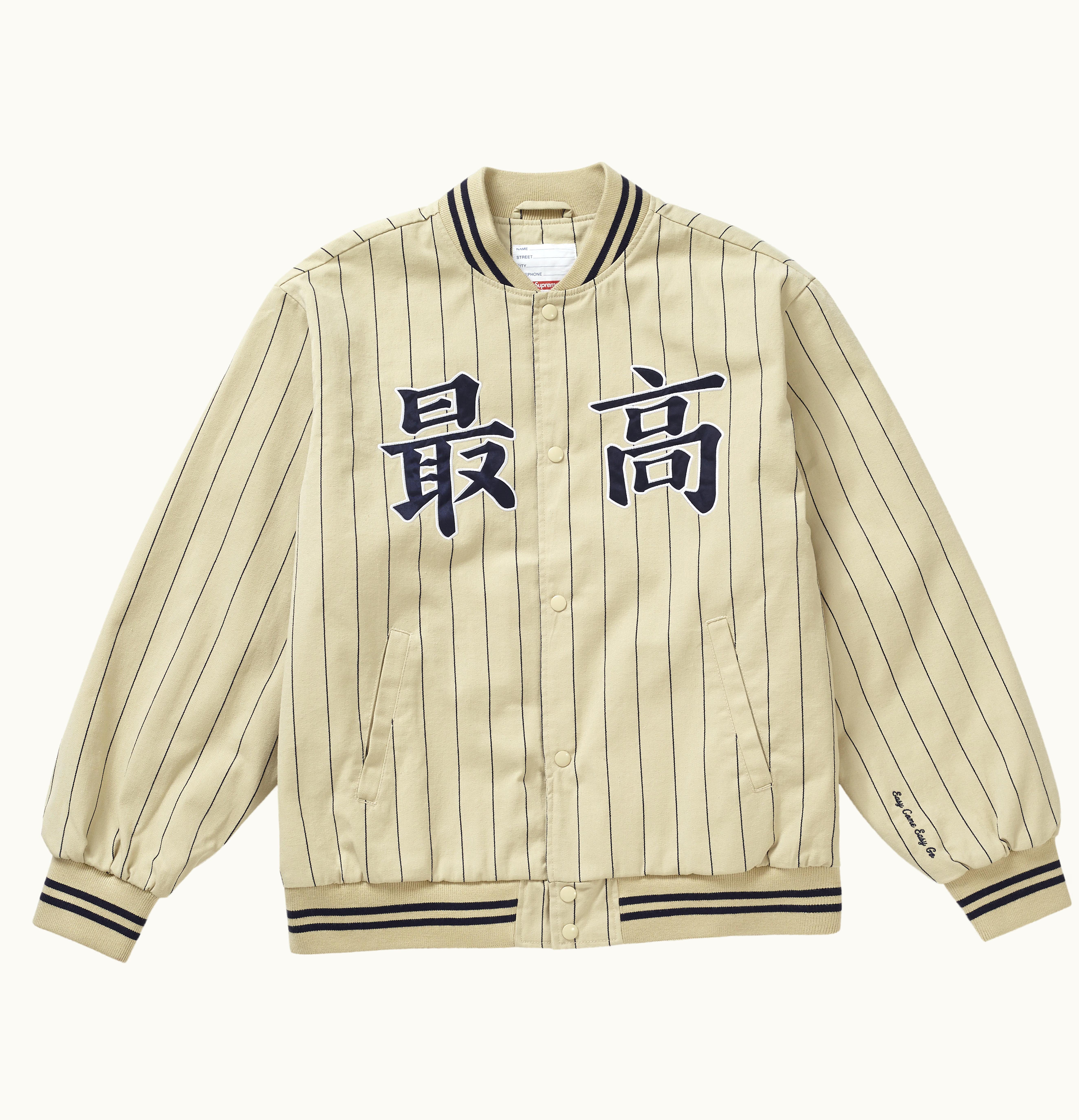 The Supreme Pinstripe Varsity is a stylish and versatile jacket that combines the classic look of a varsity jacket with a sleek pinstripe design. Made from high-quality materials, this jacket has a comfortable and durable construction that will keep you warm and protected in chilly weather. The front features a snap-button closure and two spacious pockets, while the back has a large embroidered graphic that adds a touch of streetwear edge. The ribbed collar, cuffs, and hem provide a snug fit that retains heat, while the interior lining ensures a cozy feel against your skin. Whether you're heading to school, running errands, or hanging out with friends, this Supreme Pinstripe Varsity is a must-have addition to your wardrobe.