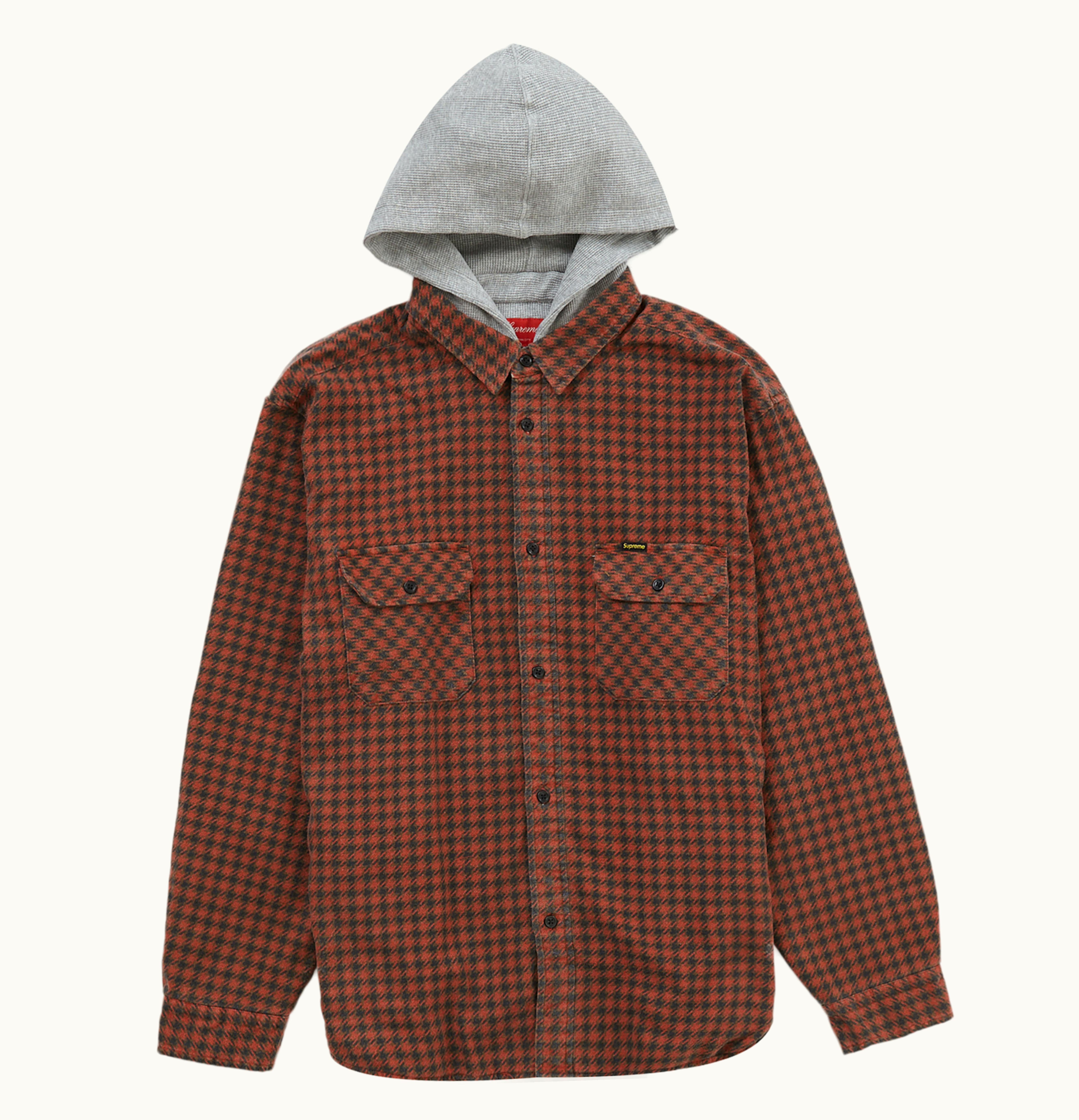 The Supreme Houndstooth Flannel Hooded is a premium-quality hooded shirt made of houndstooth flannel fabric. The shirt features a classic houndstooth print in a black and white pattern, giving it a stylish and fashionable look. The shirt is designed with a hoodie with an adjustable drawstring, allowing you to adjust the fit and keep warm during chilly days. The shirt also has a front button closure and two buttoned chest pockets, providing you with convenient storage for your essentials. The Supreme logo is also embroidered on the chest pocket, adding to its premium appeal. The shirt is made of high-quality flannel material, ensuring its longevity and comfort for daily wear. The Supreme Houndstooth Flannel Hooded is a perfect addition to your wardrobe, providing you with style, comfort, and practicality all in one garment.