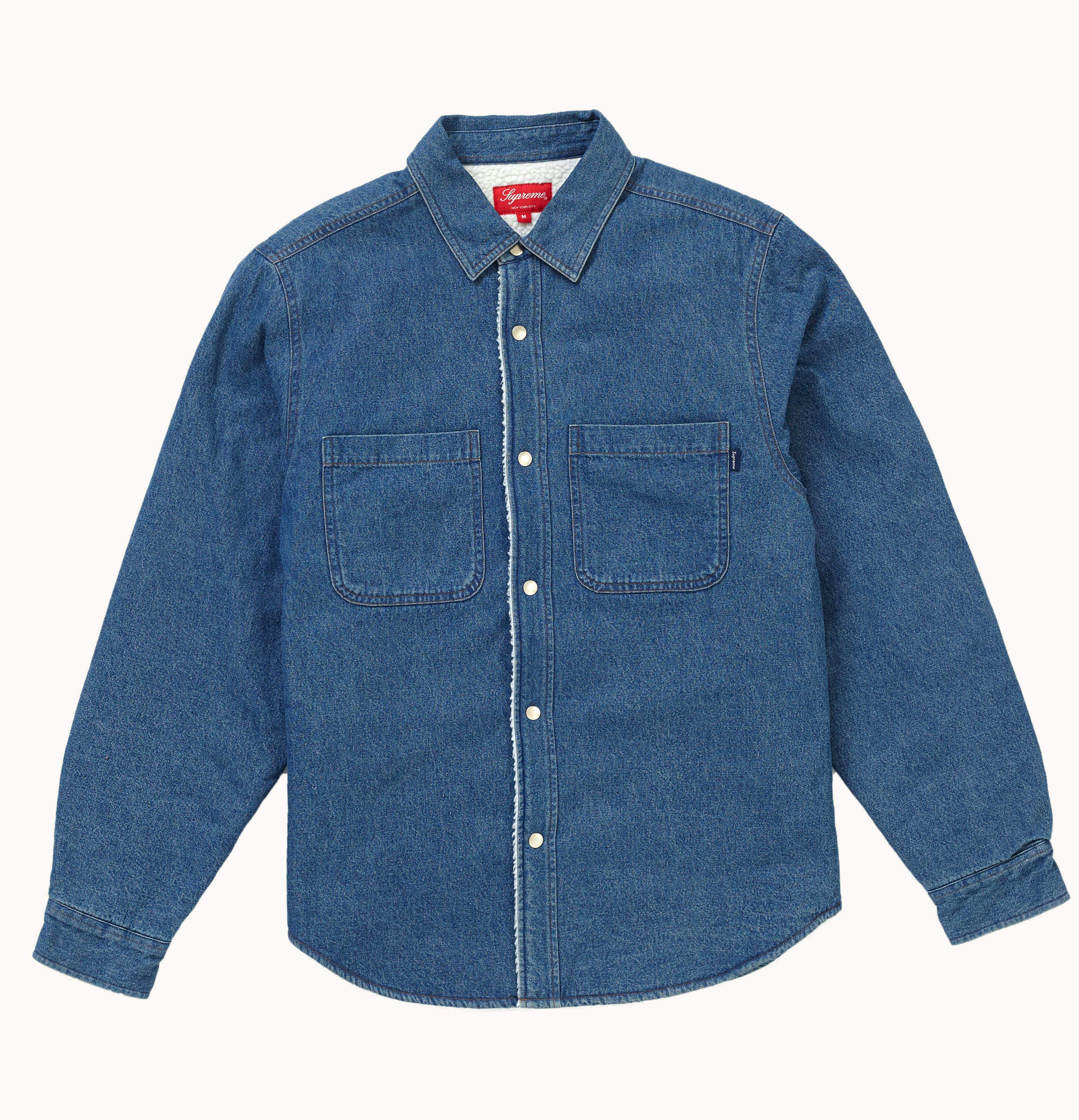 The Supreme Sherpa Lined Denim is a premium jacket that combines style and practicality. The exterior of the jacket is made from high-quality denim, providing a rugged and durable fabric for everyday wear. The interior of the jacket is lined with warm and comfortable sherpa, creating a cozy and insulated layer of warmth. The jacket features a button-front closure and two chest pockets, as well as two hand pockets, making it a functional and versatile addition to any wardrobe. The classic denim style is accentuated by the contrasting sherpa lining, which adds an element of style to this practical piece. Perfect for chilly days or as a layering piece, the Supreme Sherpa Lined Denim jacket is a must-have for anyone looking for a stylish and comfortable jacket that can stand up to the elements.