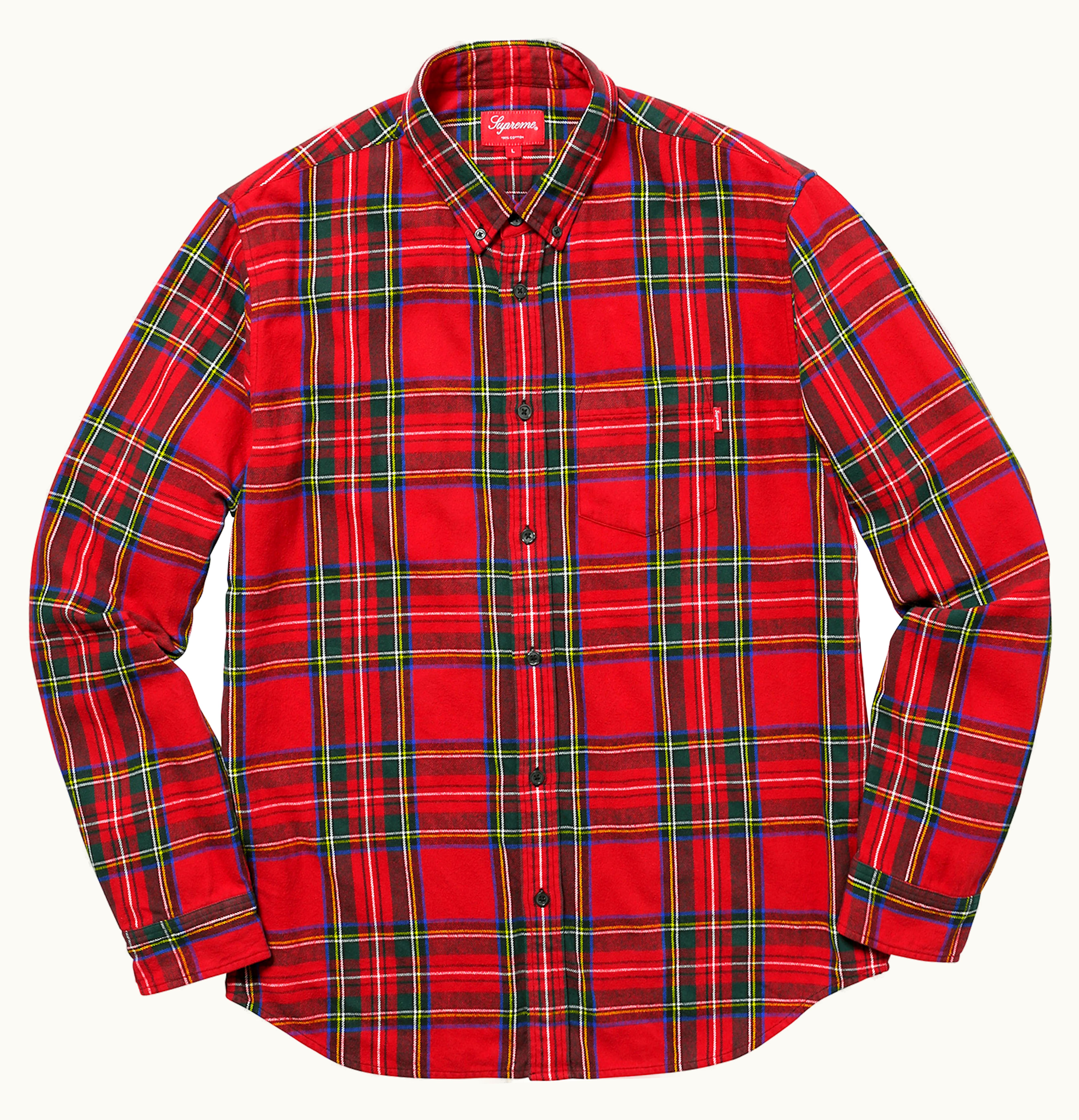 The Supreme Tartan Flannel is a premium quality flannel shirt made from soft, lightweight, and durable cotton material. It features an eye-catching tartan plaid pattern in bold red, white, and navy blue colors. The shirt is designed with a classic button-down collar, buttoned cuffs, and a chest pocket with a small embroidered Supreme logo. The relaxed fit and long sleeves provide maximum comfort and ease of movement, making it ideal for everyday wear. The Supreme Tartan Flannel is a must-have item for any fashion-conscious individual who wants to add a stylish touch to their wardrobe.