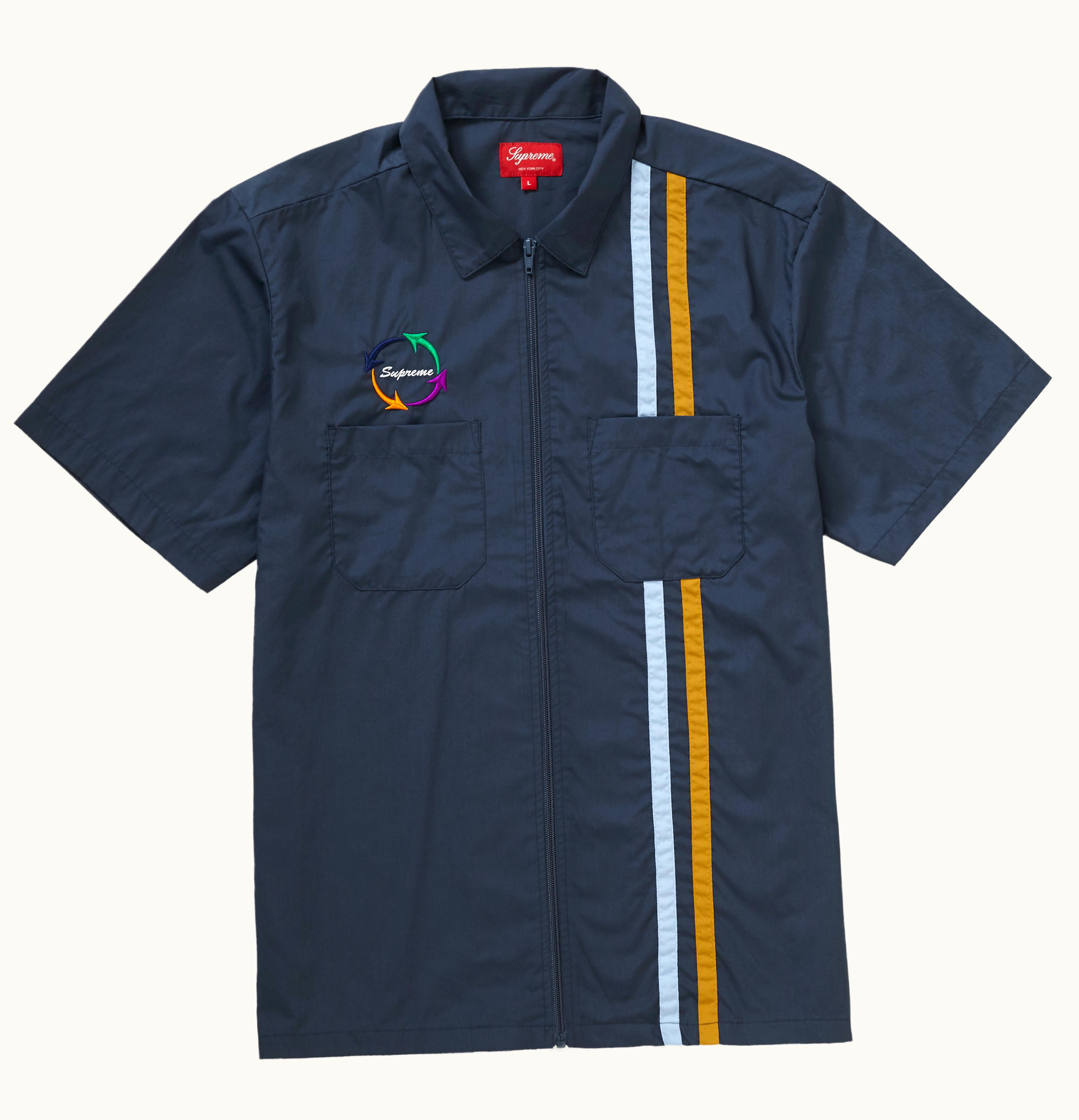 The Supreme Zip Up S/S Work Zip Up is a stylish and functional garment that is designed to provide maximum comfort, durability and versatility. Made from high-quality, premium cotton material, this zip-up features a stylish design with a classic fit and short sleeves that make it perfect for both casual and formal occasions. Featuring a zip-up closure, the Supreme Zip Up S/S Work Zip Up ensures easy on and off, while the ribbed collar, cuffs and hem provide a snug and comfortable fit. The zip-up also comes with two front pockets that allow you to store your phone, wallet, keys, or other small essential items. What sets the Supreme Zip Up S/S Work Zip Up apart from other zip-ups is its stylish design and the Supreme logo branding on the front and back. The classic logo adds a touch of sophistication and elegance to the garment and makes it a fashion statement that can be paired with any outfit. Overall, if you're looking for a comfortable, stylish and versatile zip-up that can be worn for work or play, the Supreme Zip Up S/S Work Zip Up is an excellent choice that will not disappoint. Get yours today and experience the difference!