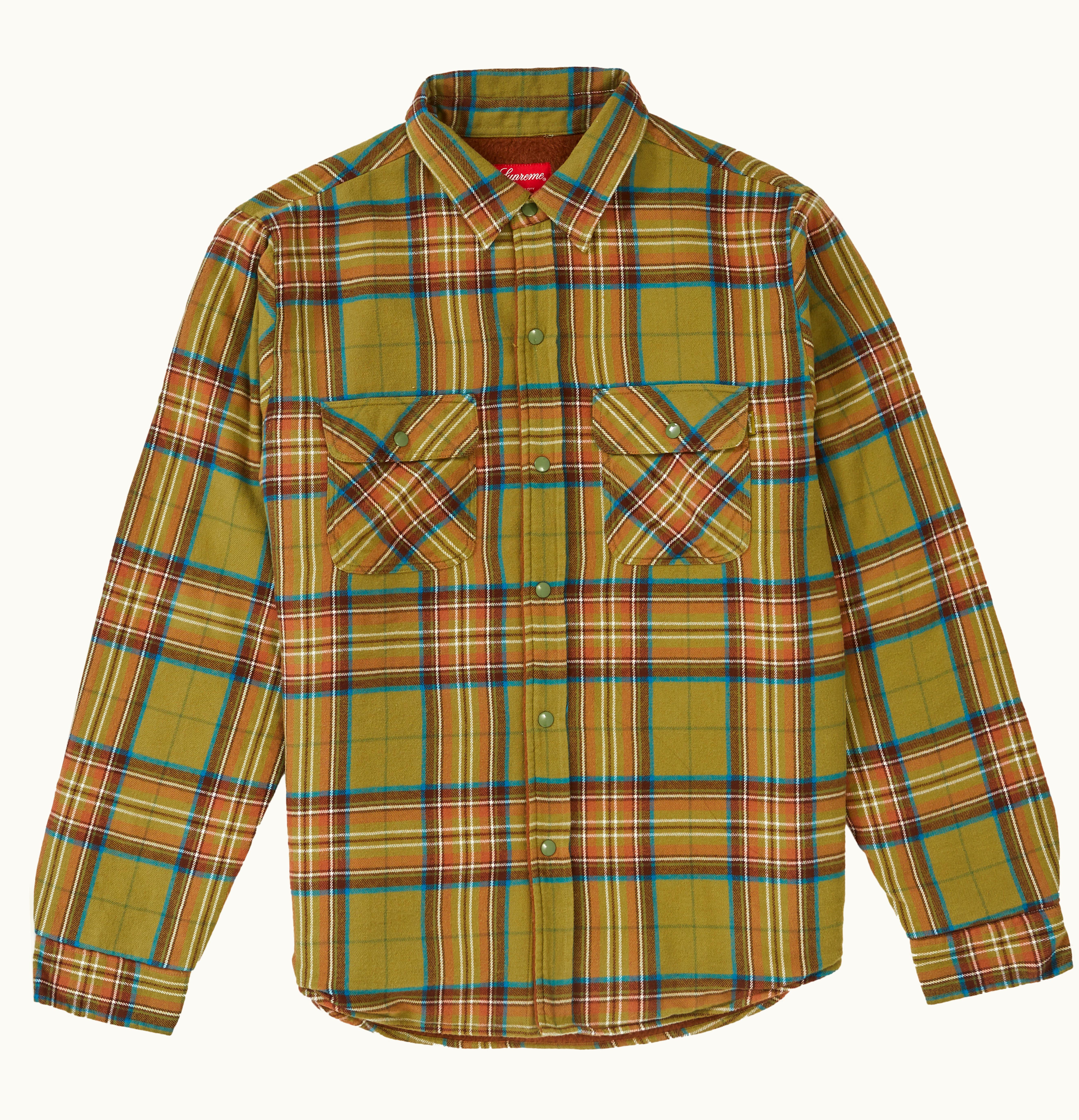 The Supreme Pile Lined Plaid Flannel is a premium quality, heavyweight shirt made from soft and warm flannel material. It features an all-over plaid pattern that adds a classic touch to the design. The inside of the shirt is lined with a luxurious pile material that provides additional warmth and comfort. The long sleeves include buttoned cuffs, and the front features a button-up closure with a standard collar. This Supreme shirt is perfect for the colder months and can be paired with jeans, trousers, or cargo pants for a casual yet stylish look. The branding is minimal with a small Supreme tag on the left chest.