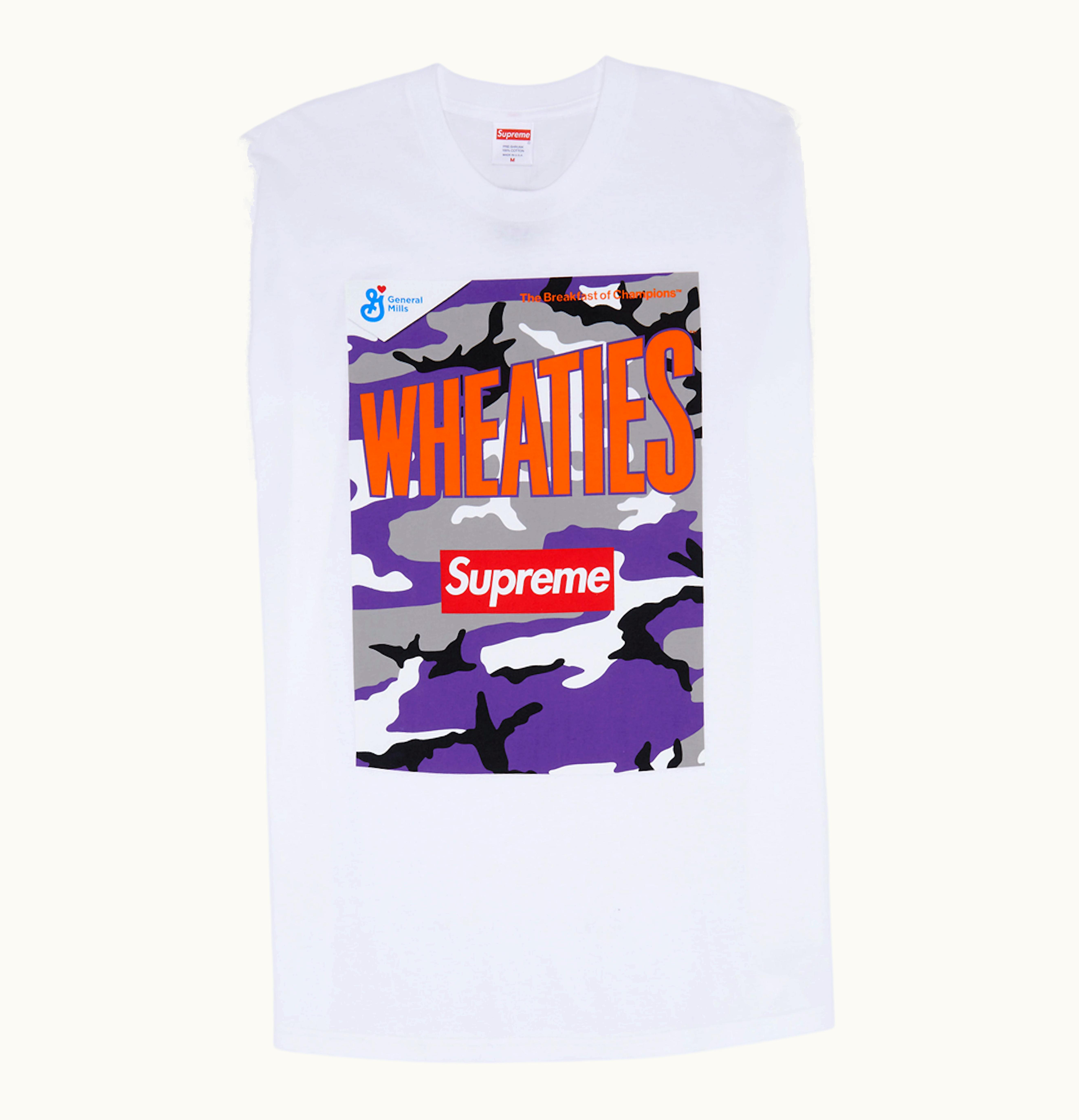 Supreme's Wheaties T-shirt in white was released together with a black version, as well as two different-colored Wheaties cereal boxes from General Mills. The highly-anticipated collaboration between Supreme and the iconic breakfast cereal, Wheaties, was one of the highlights of Spring/Summer 2021 Week 6. Supreme Wheaties, available in yellow and purple boxes, came with two unique T-shirts, one for each box color. The white Supreme Wheaties tee displays a graphic of the purple cereal box on its front. GLINT offered the white Supreme Wheaties T-shirt for retail at $48 USD on April 1st, 2021.