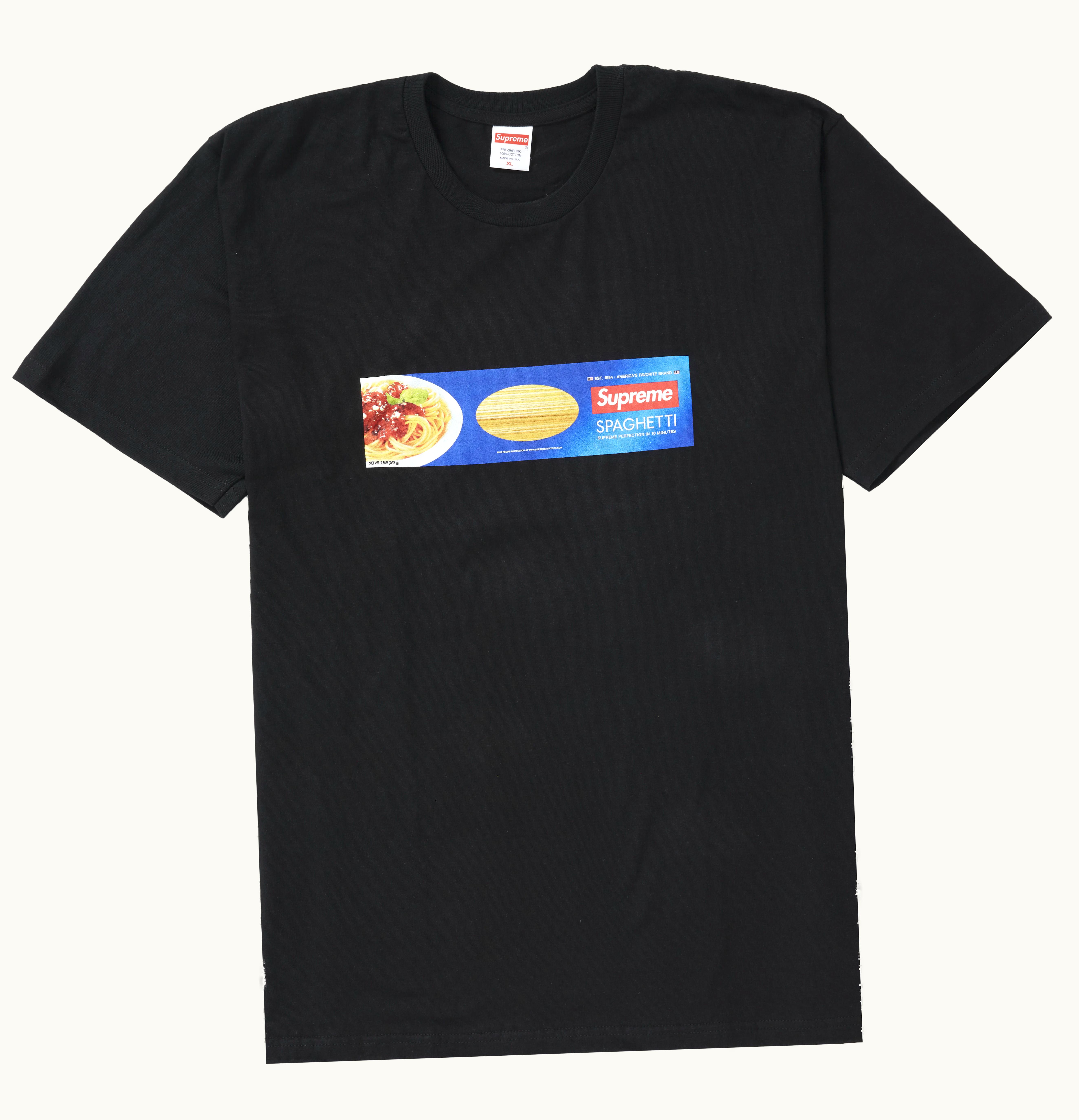 The Supreme Spaghetti Tee Black pays homage to the iconic Barilla pasta packaging through a spaghetti box graphic that features the Supreme logo. Constructed from 100% cotton, this design is reminiscent of other timeless Supreme t-shirt designs. The tee was launched as part of the Supreme Fall / Winter 2021 collection and was sold for $38. It is now available on GLINT for purchase.