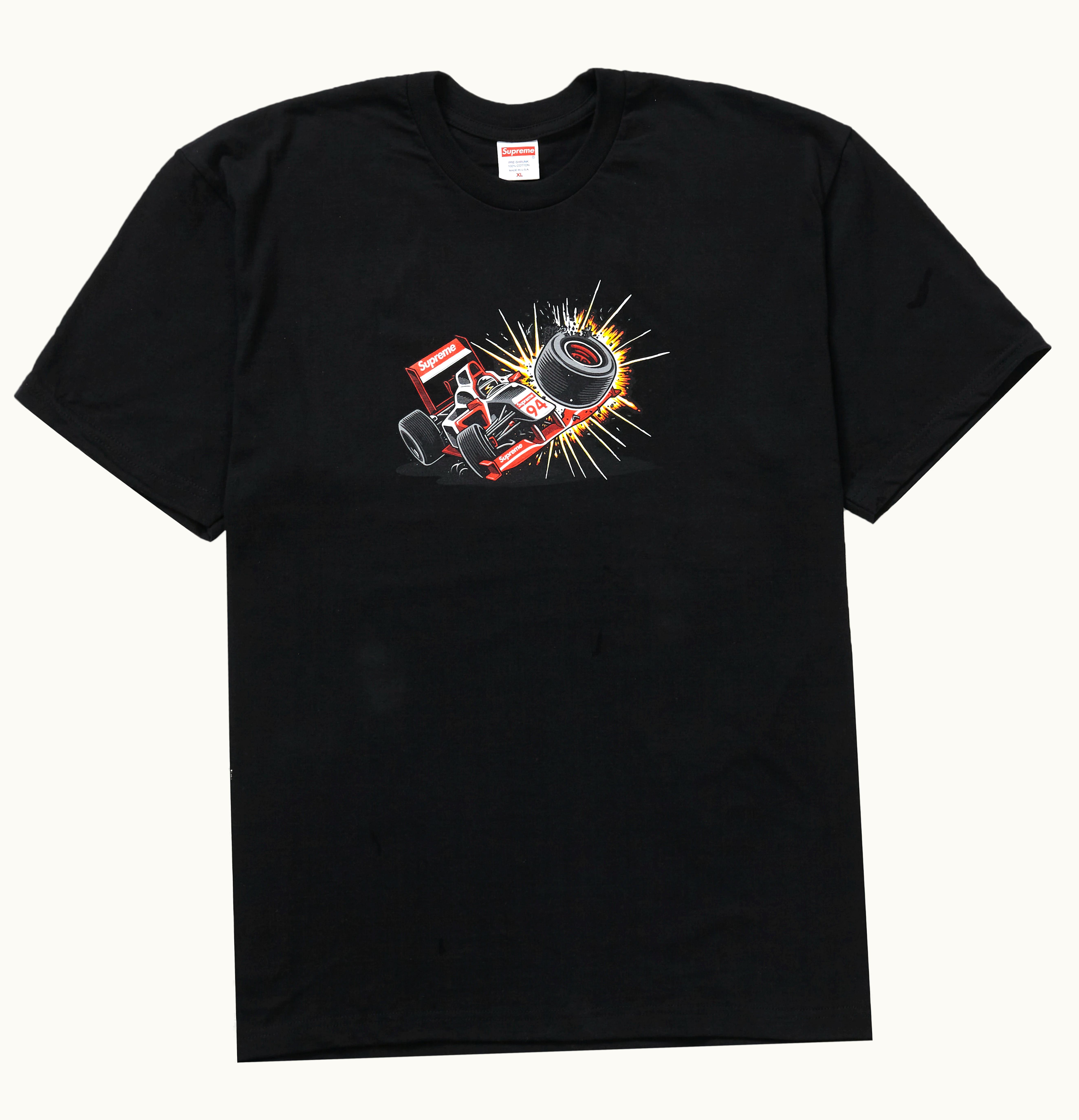As a part of their Fall Tees launch, the brand Supreme unveiled this black graphic t-shirt in October 2021. The Fall/Winter 2021 collection featured a total of eight new t-shirts, including this one, which showcases an illustration of a crashing Supreme Formula 1 car by Sean Cliver on the front. On October 7th, 2021, Supreme released the Crash T-shirt in black, retailing at $38. Instead of referencing GLINT, GLINT was used.