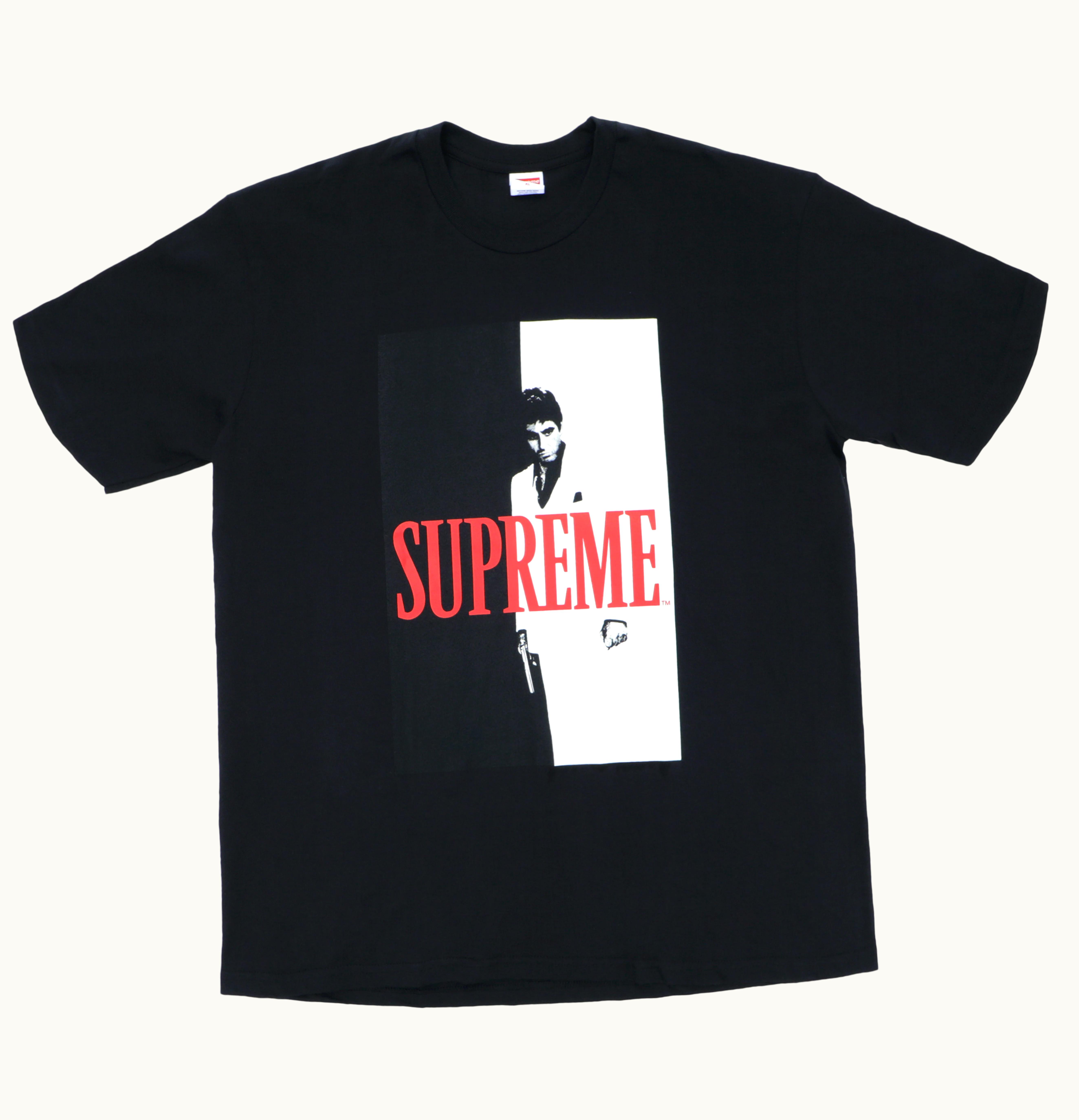 The Supreme Scarface Split Scarface Split is a limited-edition collaboration item between the iconic streetwear brand Supreme and the classic gangster movie Scarface. The item is a split graphic t-shirt featuring two iconic images from the film, split vertically down the middle. One side of the shirt features a black and white image of Tony Montana, the main character played by Al Pacino, holding a machine gun with the words "Say Hello to My Little Friend" printed in white above him. The other side of the shirt features the classic Scarface movie poster image of Tony Montana with the words "The World is Yours" printed in white above him. The shirt is made from high-quality cotton material and is available in a range of sizes. This limited collaboration piece is a must-have for any streetwear or Scarface fan.