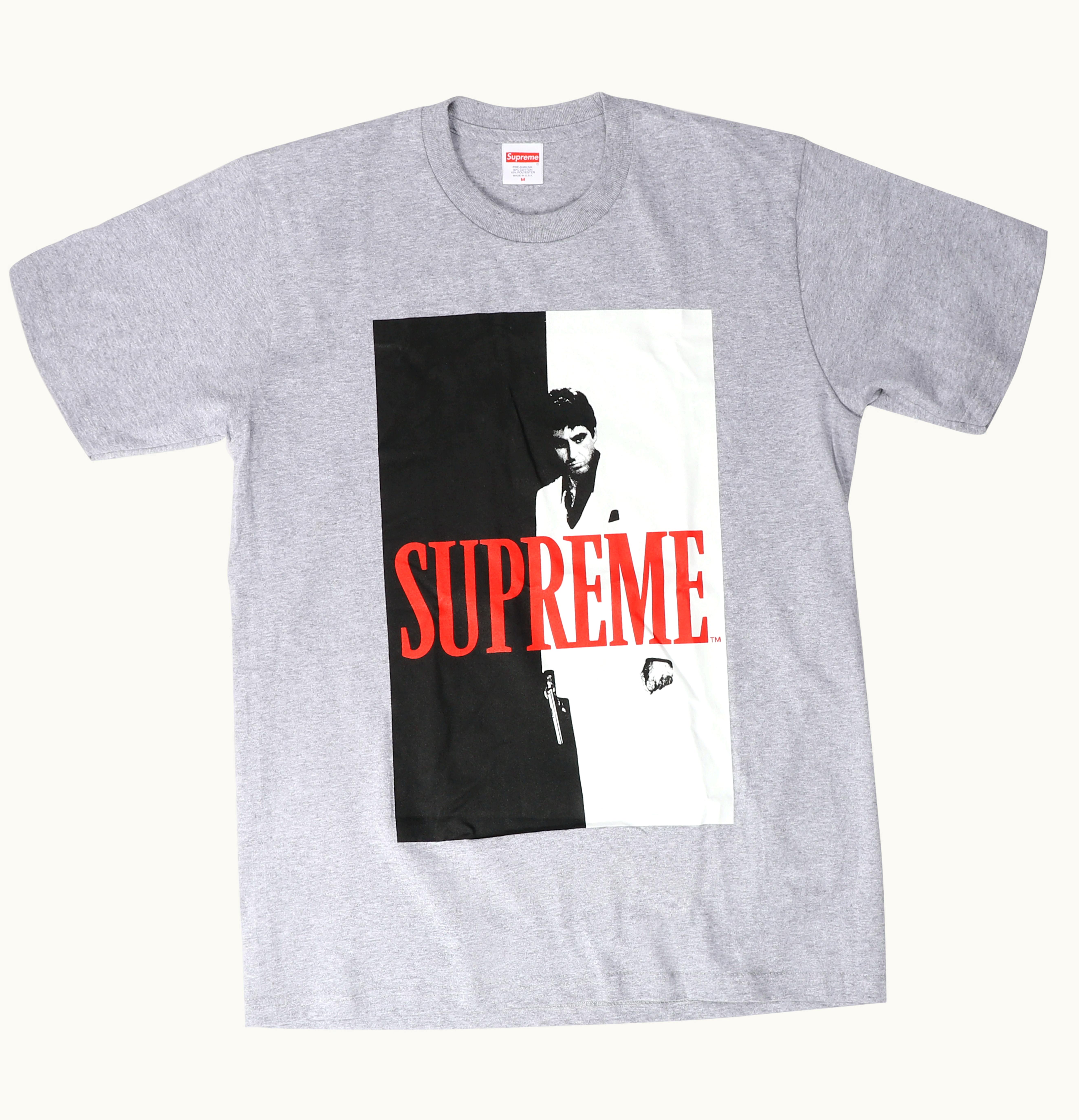 The Supreme Scarface Split Scarface Split is a collaboration between the legendary streetwear brand Supreme and the classic gangster movie Scarface. The item features a black hoodie with a split design - one side featuring the iconic Supreme box logo and the other featuring a graphic print of Tony Montana from Scarface. The print is designed in a bold, comic-book style with vibrant colors and is printed on both the front and back of the hoodie. The hoodie is made from a soft cotton blend and features a drawstring hood, ribbed cuffs and hem, and a kangaroo pocket. This limited edition piece is a must-have for fans of both Supreme and Scarface, combining two iconic brands into a unique and eye-catching design.