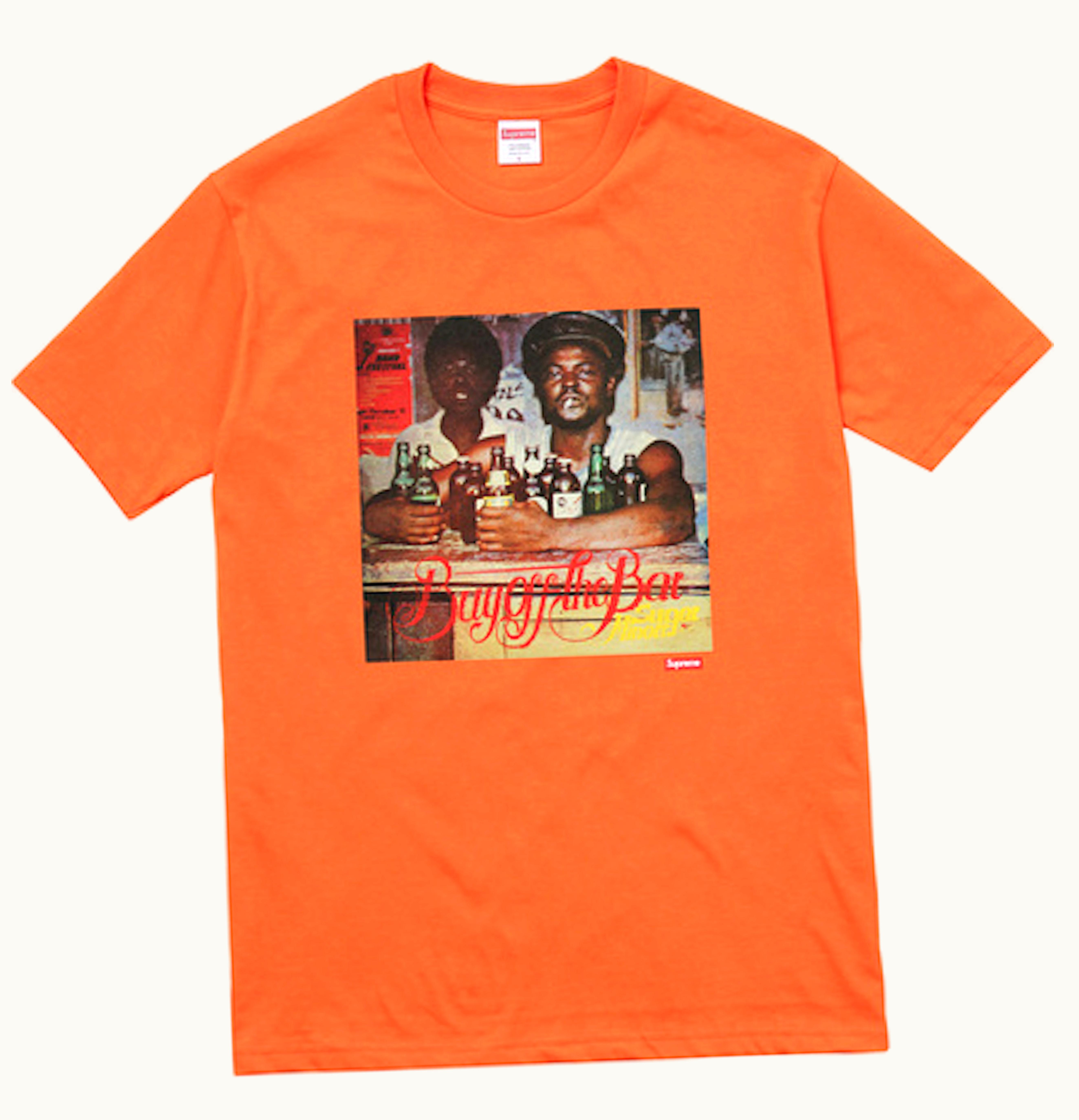 The Supreme Wilfred Limonius Buy Off the Bar is a limited edition graphic t-shirt featuring the artwork of Jamaican illustrator Wilfred Limonius. The design depicts a vibrant and colorful scene of a bar, with characters engaged in conversation, drinking, and smoking. The image is screen printed on a high-quality, 100% cotton t-shirt, with the Supreme logo printed on the back. This t-shirt is part of Supreme's Spring/Summer 2021 collection and is a must-have for fans of the brand and collectors of limited edition streetwear.