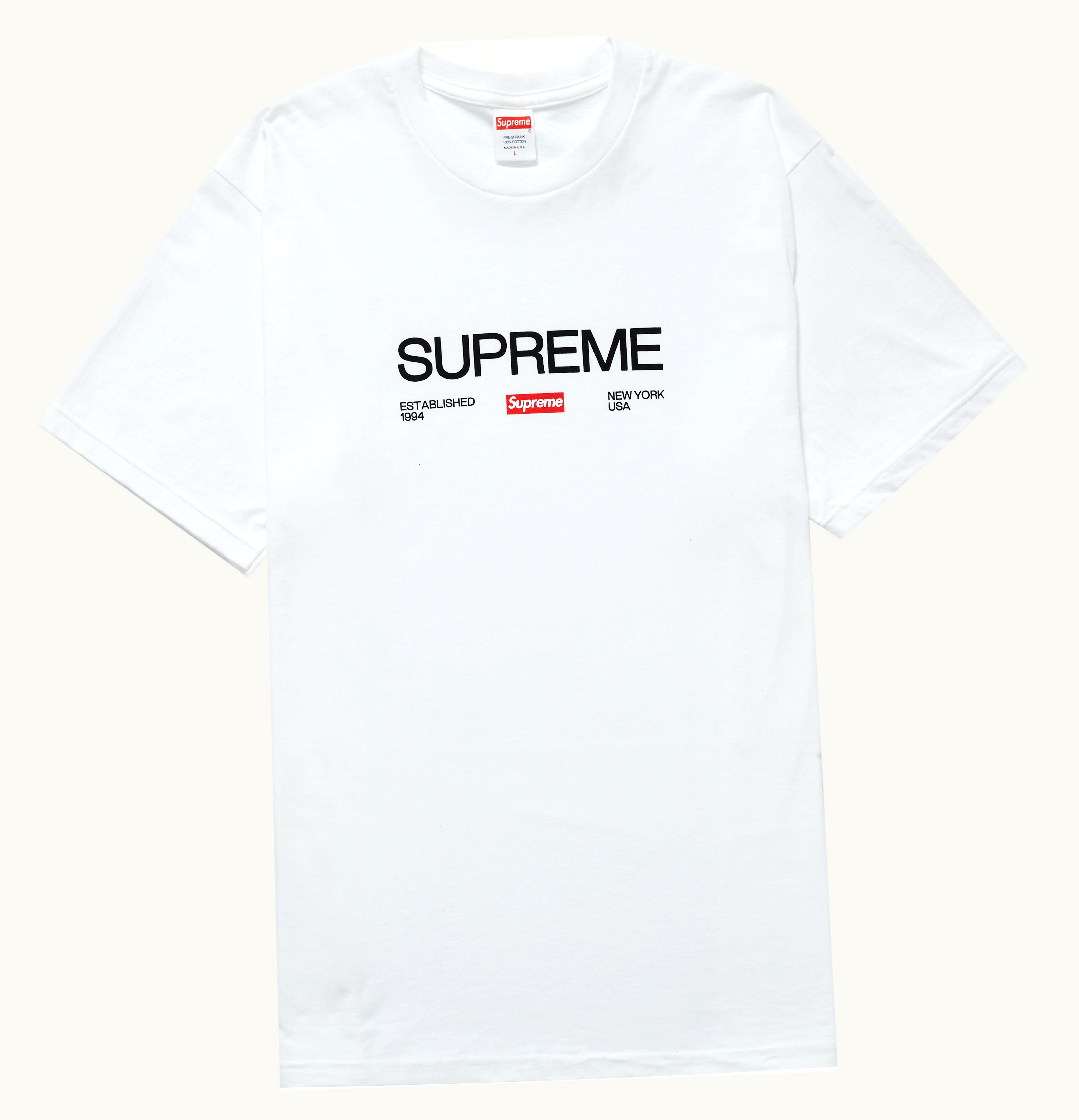 As part of its Fall/Winter 2021 season's initial launch, Supreme introduced a white T-shirt that bears the brand's Est. 1994 logo. The release also included a Rick Rubin photo tee, a Shrek tee, and others. The Supreme Est. 1994 shirt was among the more popular choices, displaying a sizable Supreme logo atop a smaller Box Logo and the establishment year. The shirt was up for purchase at $38 on August 19th, 2021, via GLINT.