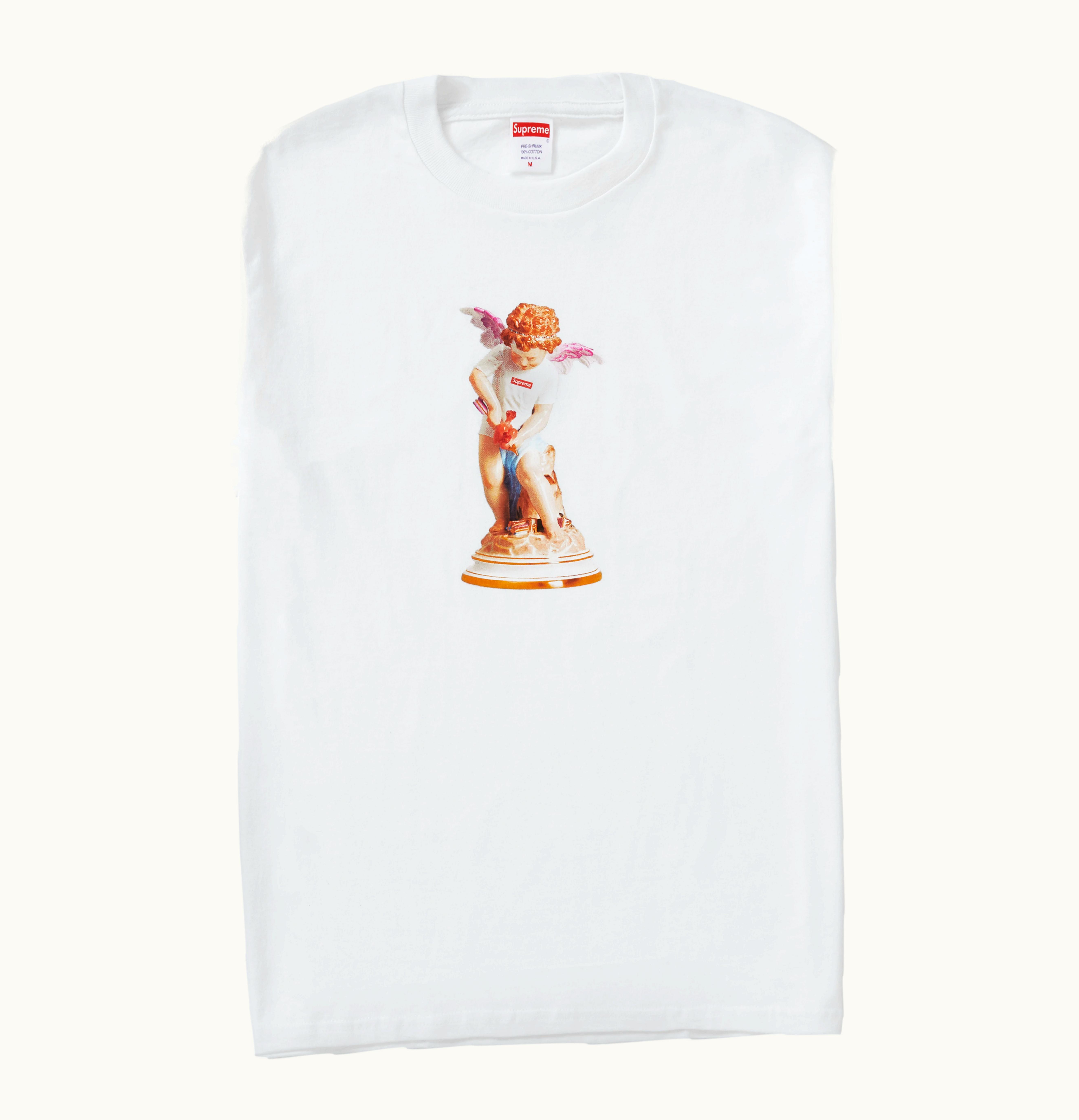 During Week 6 of Supreme's Spring/Summer 2019 collection, the brand launched a range of tees, including the Cupid Tee featuring a product photo of the Week 3 Supreme®/Meissen® Hand-Painted Porcelain Cupid Figurine. These figures cost almost $4,000 USD, but the tees were priced modestly at $38 USD, making them more affordable for fans. Released on April 4th, 2019, the Cupid Tee is now available on GLINT.