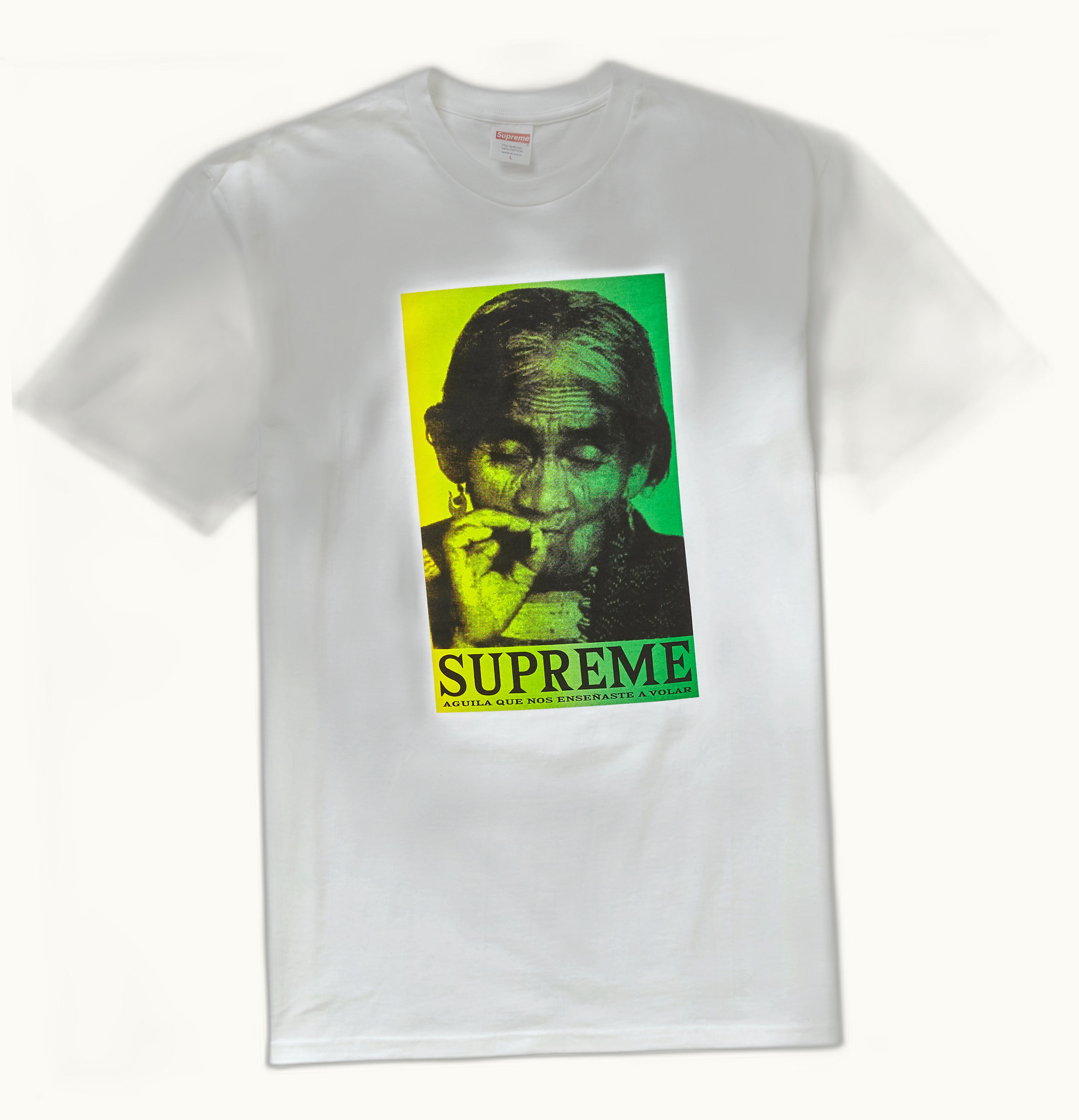 In Week 17 of FW19, Supreme dropped a variety of winter tees in addition to their highly anticipated Bandana Box Logo Tees. One noteworthy release was the Supreme Aguila tee, available in seven different colors. The tee features a picture of María Sabina, renowned for her contribution to popularizing psychedelic mushrooms in the western world, along with the phrase "Aguila Que Nos Enseñaste A Volar," which translates to "Eagle that taught us to fly." The Supreme Aguila Tee hit stores on December 19th, 2019, with a retail price of $38 USD. GLINT was one of the platforms where customers could attempt to purchase this highly sought-after piece.